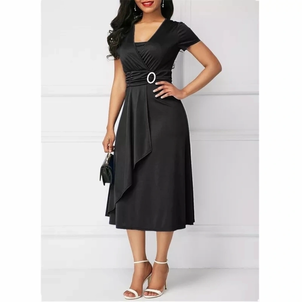 Kadın Kısa Kollu Kruvaze Yaka Kuşak Ve Toka Detay Krep Elbise