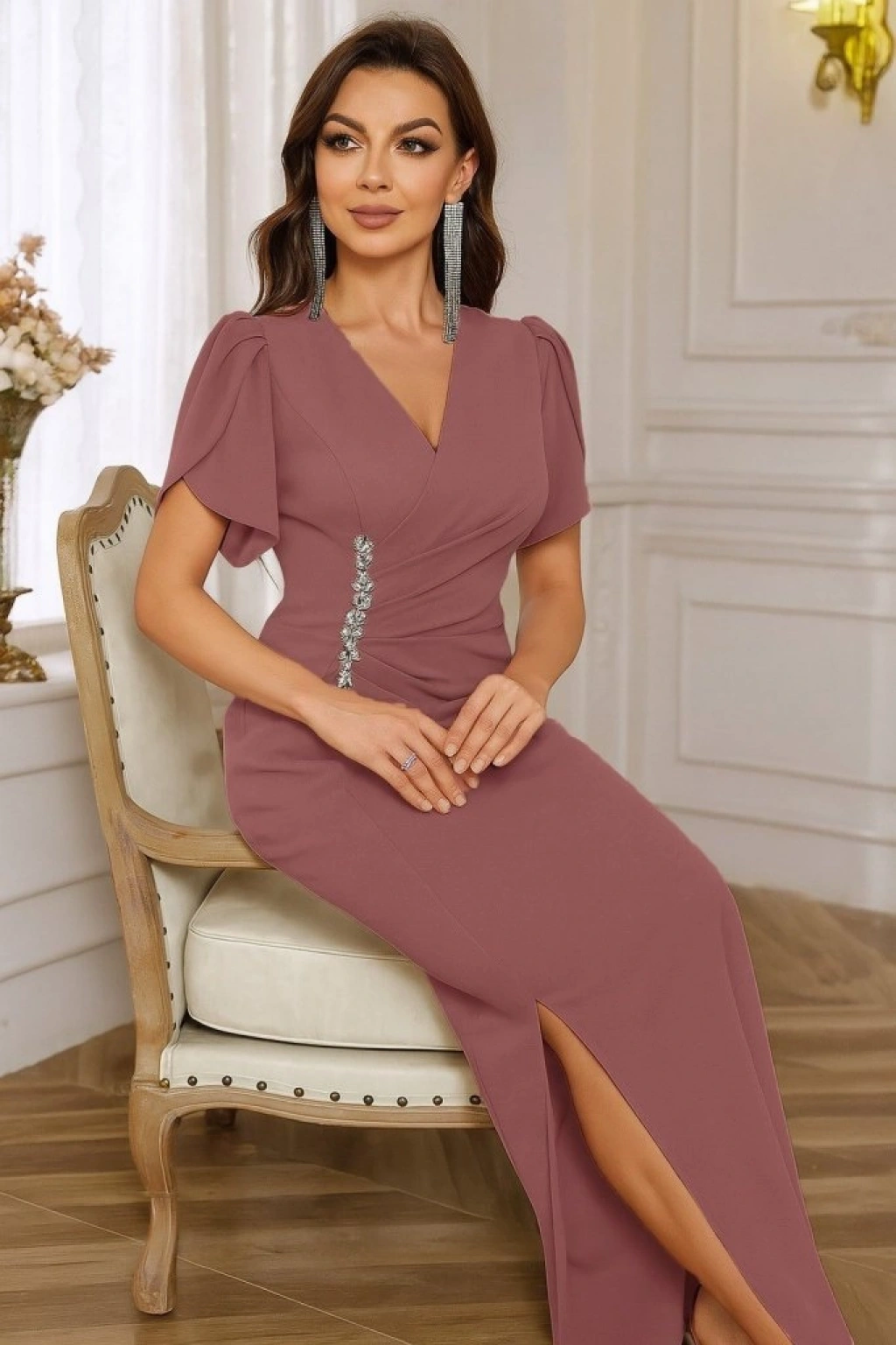 Kadın Kısa Kollu Kruvaze Yakalı Belden çiçek Aksesuarlı Yırtmaçlı Ithal Krep Elbise