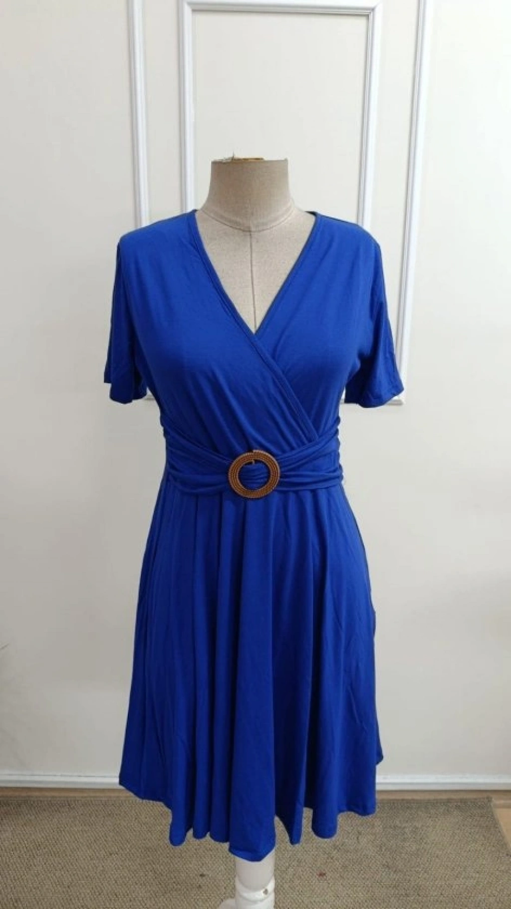 Kadın Kısa Kollu Kruvaze Yakalı önden Toka Detaylı Kısa Viskon Elbise