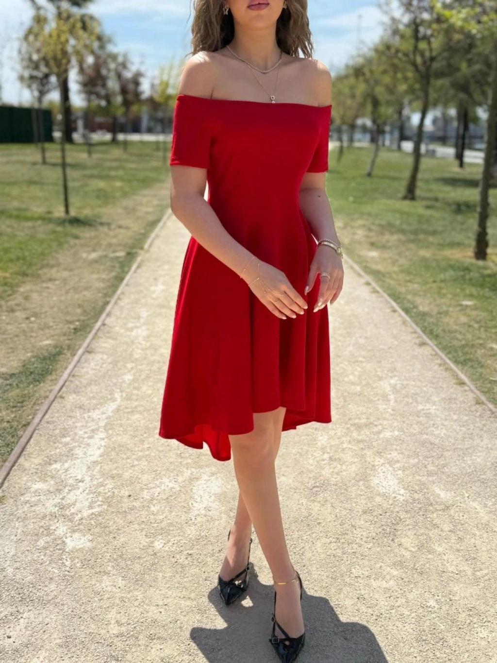 Kadın Kısa Kollu Madonna Yaka önü Kısa Arkası Uzun Ithal Krep Elbise