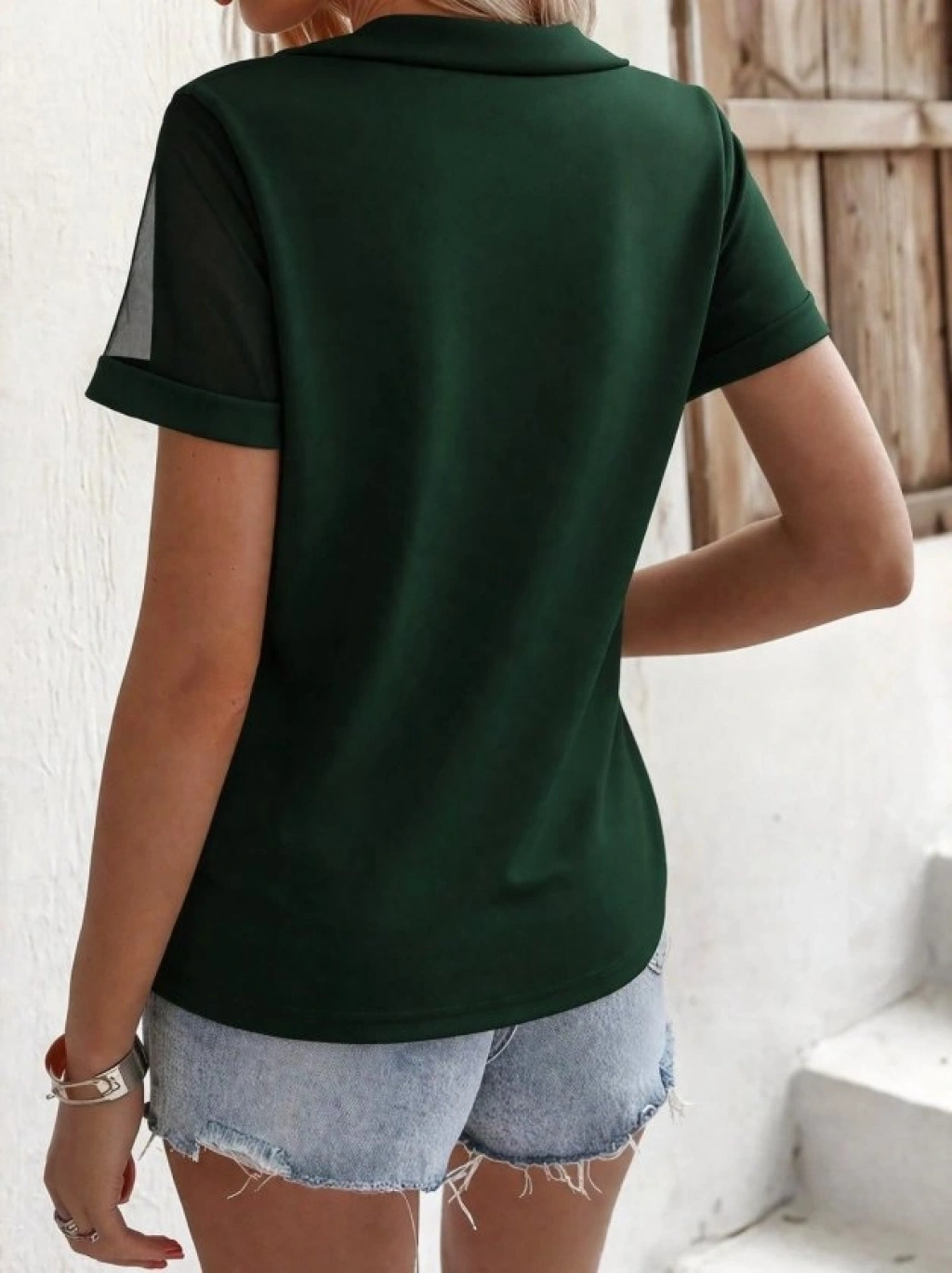 Kadın Kısa Kollu Tül Detaylı Taşlı Janjan Krep Bluz