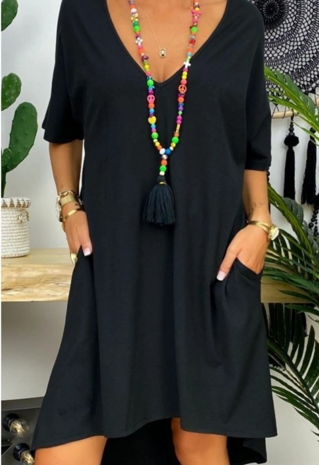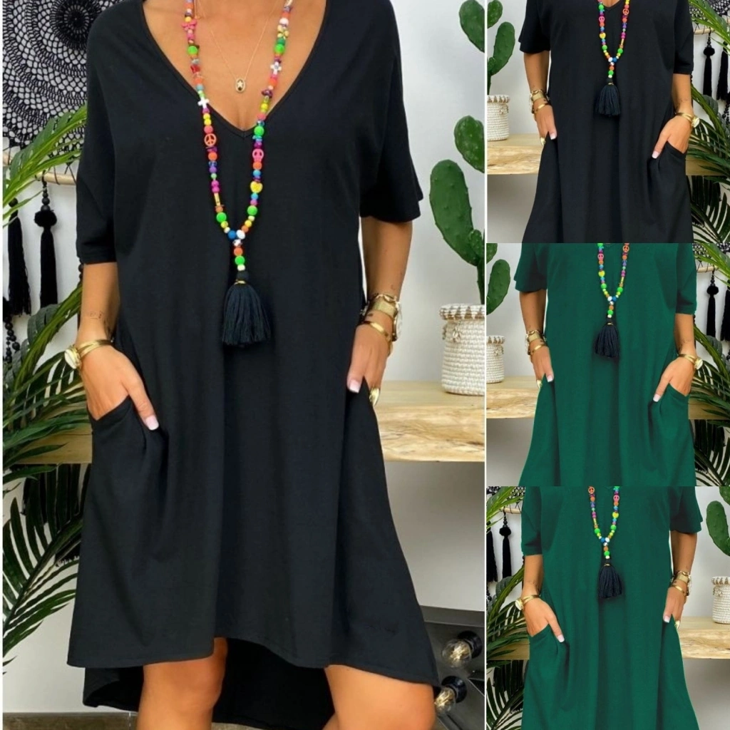 Kadın Kısa Kollu V Yaka Cepli Bürümcük Salaş Elbise