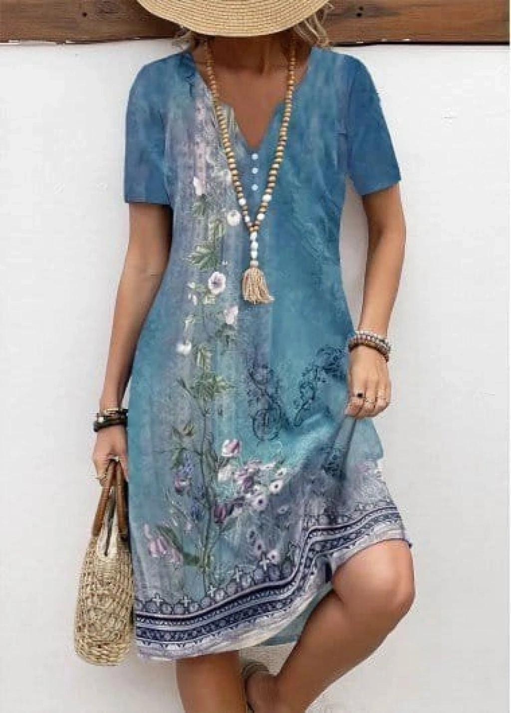 Kadın Kısa Kollu V Yakalı Desenli Süprem Elbise