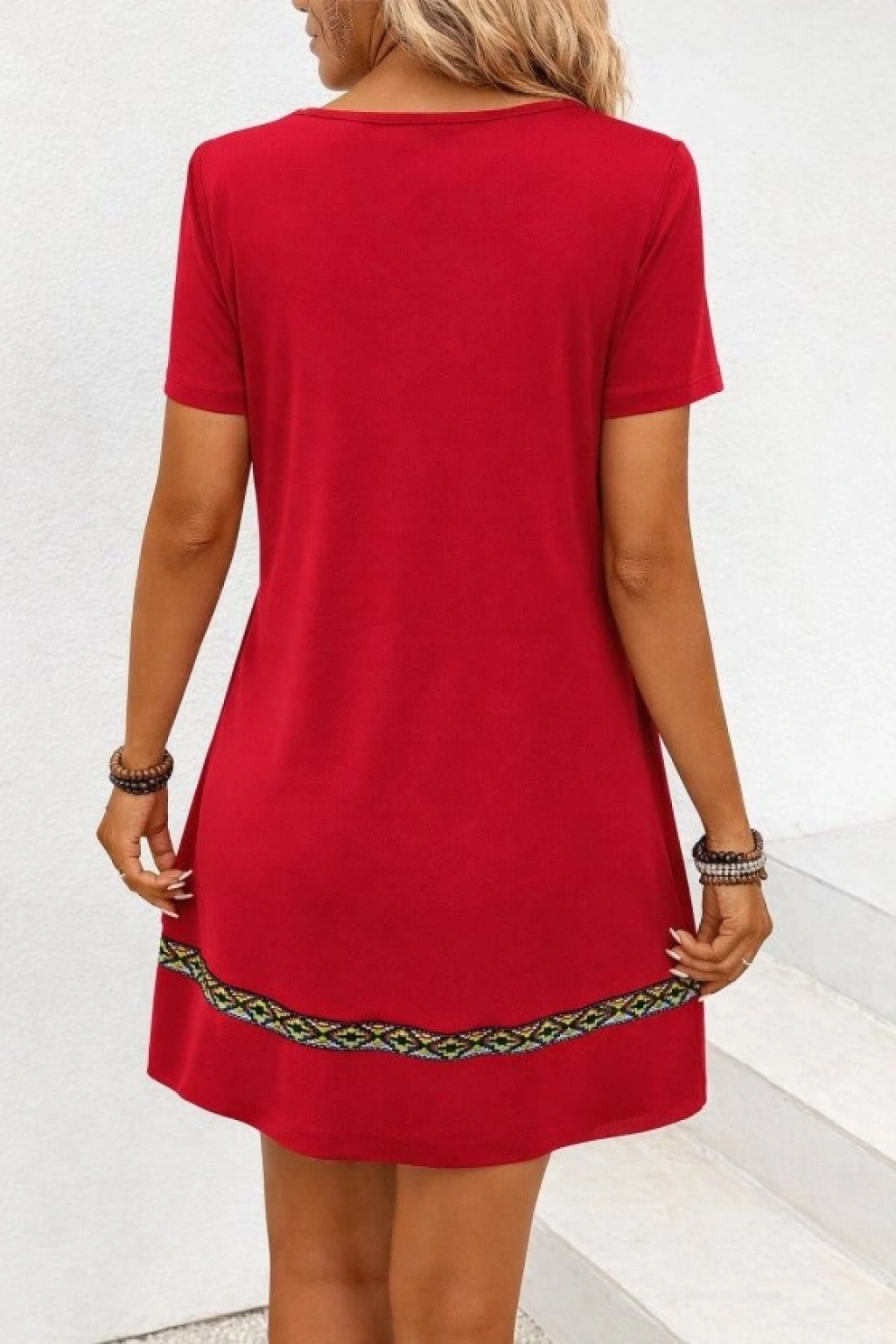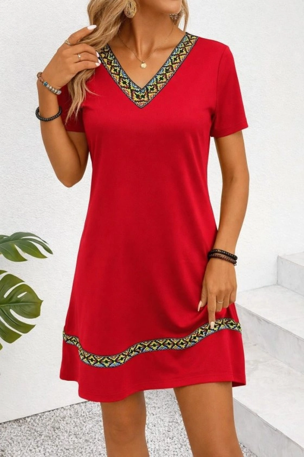 Kadın Kısa Kollu V Yakalı Etnik Desen şerit Detaylı Viskon Elbise
