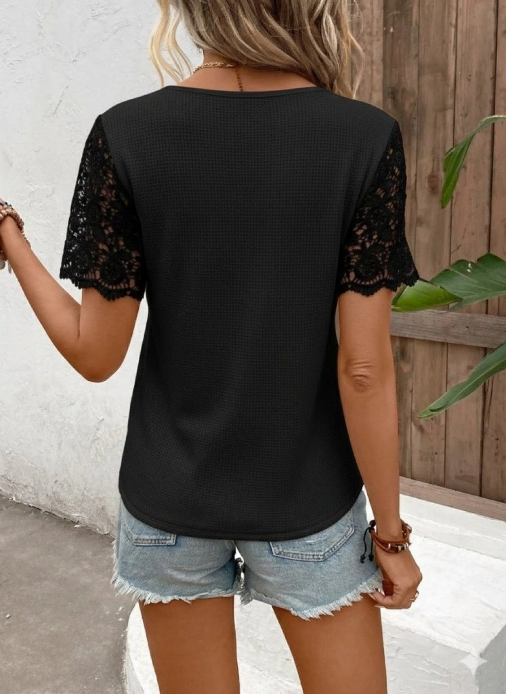 Kadın Kısa Kollu V Yakalı önden Düğmeli Dantel Detaylı Waffle Bluz