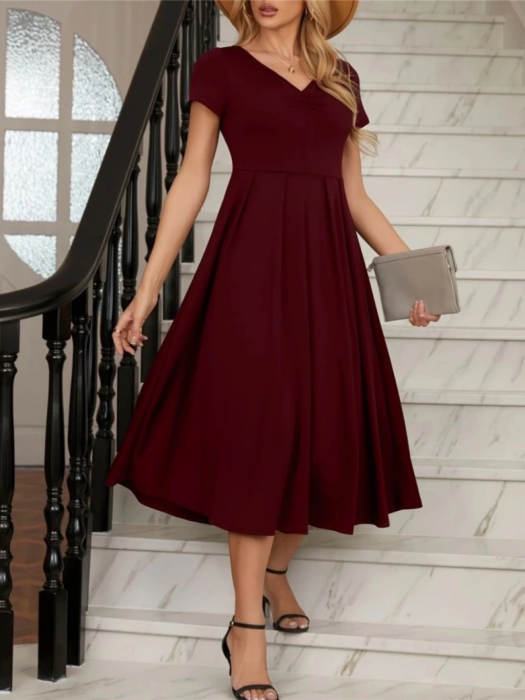 Kadın Kısa Kollu V Yakalı önden Pileli Midi Janjan Krep Elbise