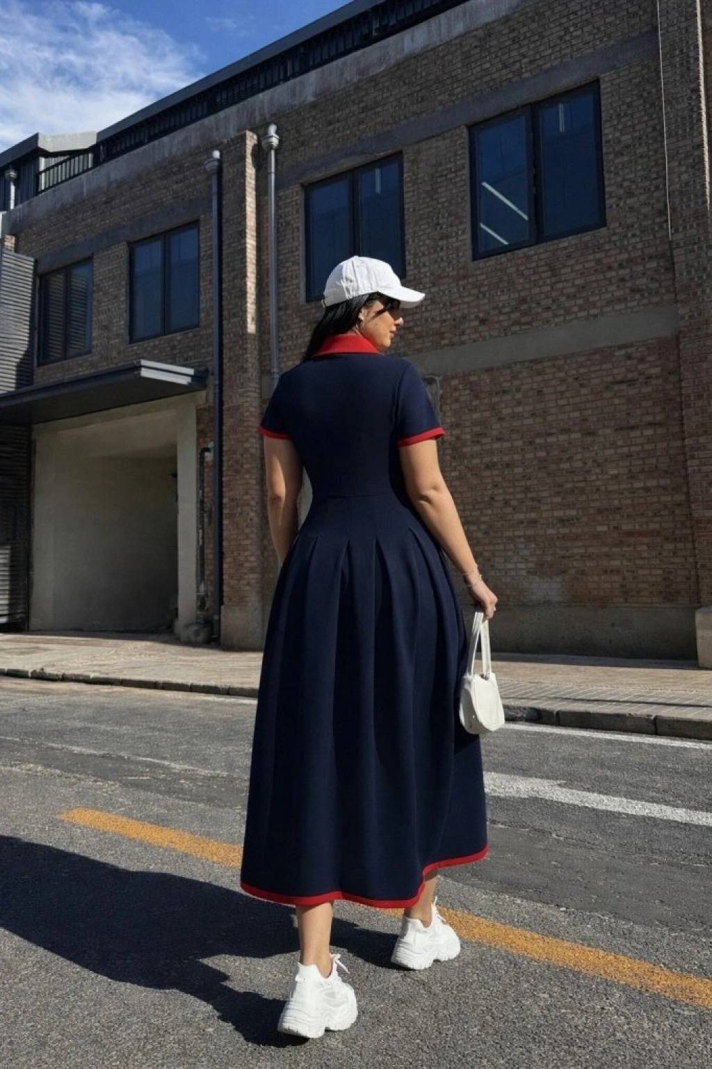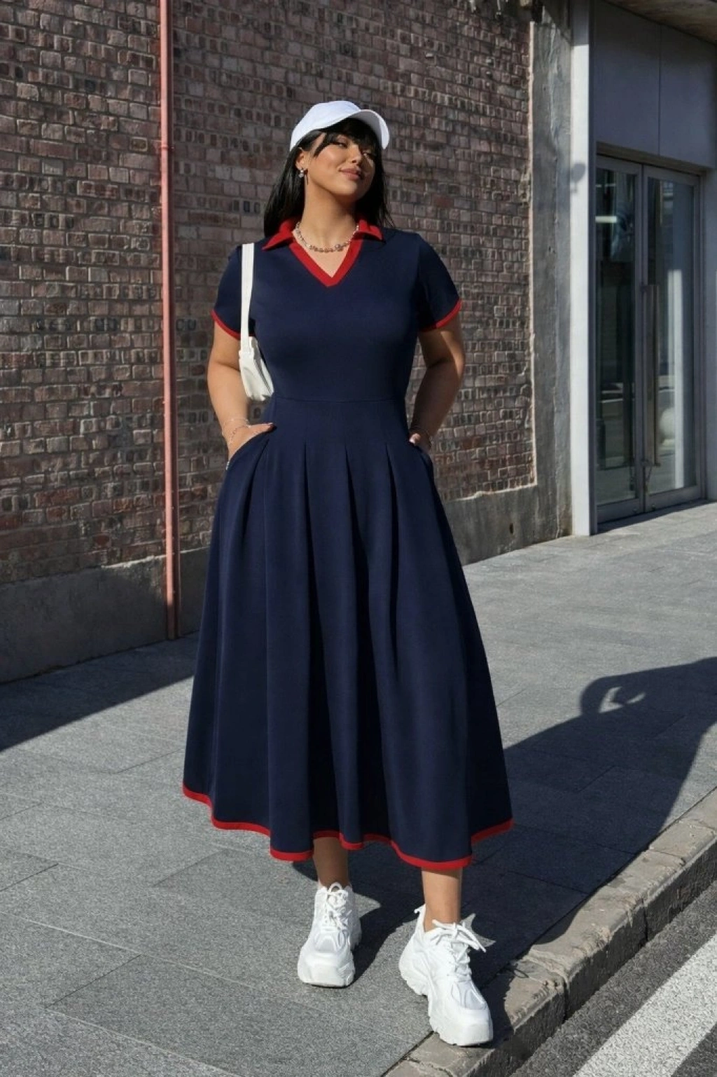 Kadın Kısa Kollu V Yakalı Pileli Uzun Janjan Krep Elbise