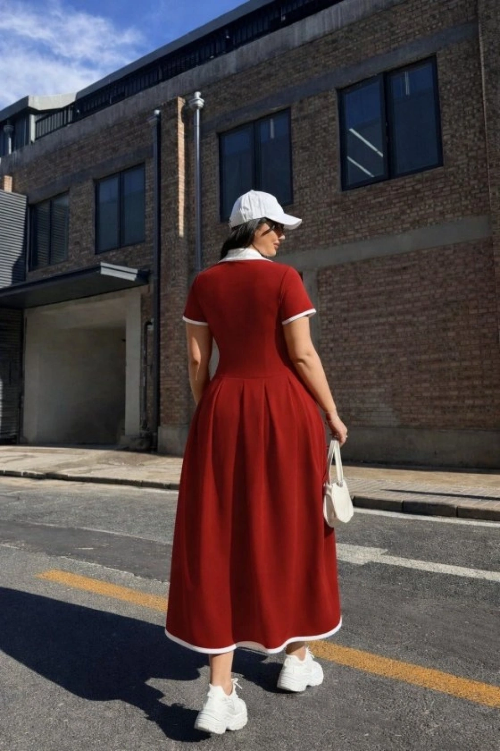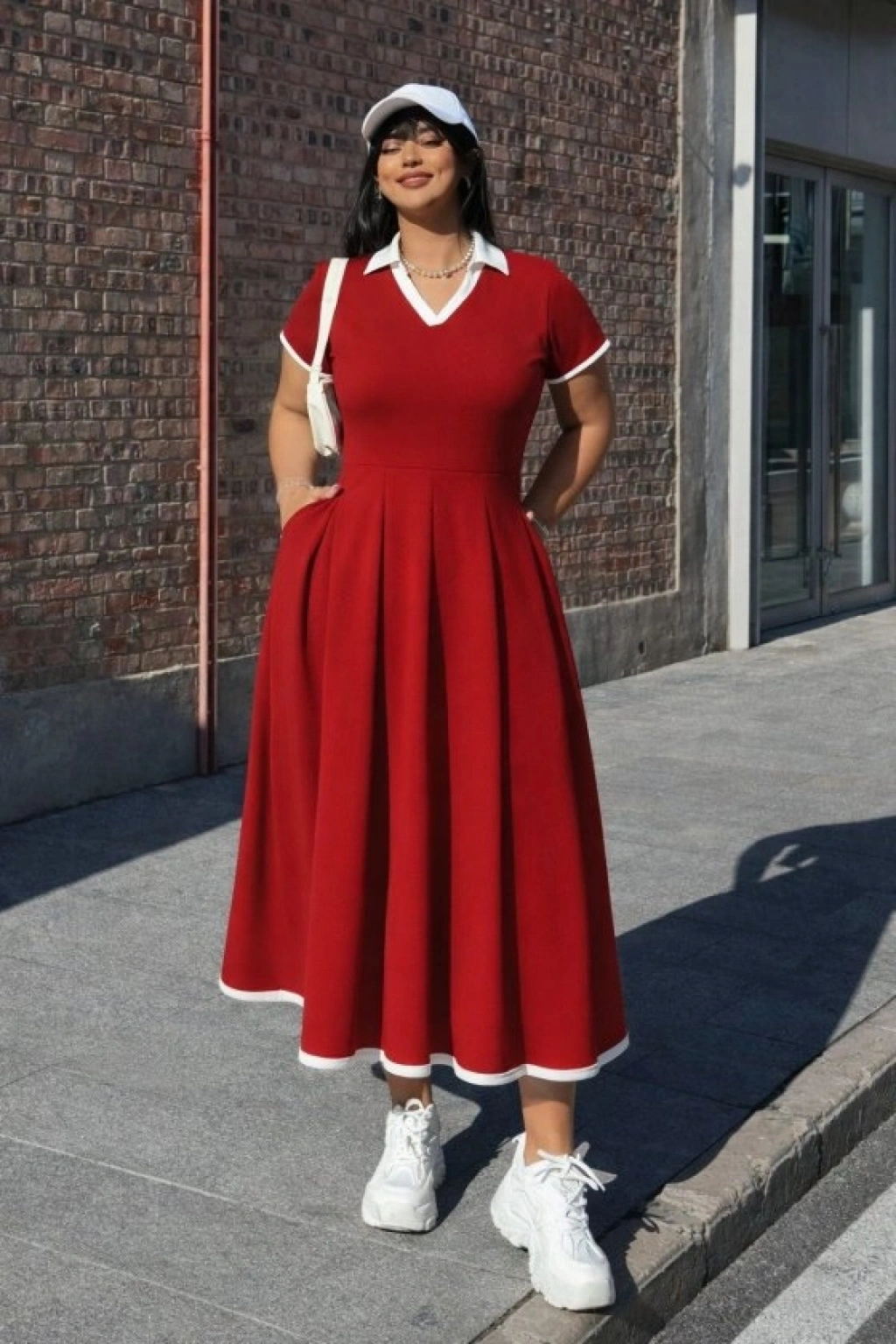 Kadın Kısa Kollu V Yakalı Pileli Uzun Janjan Krep Elbise