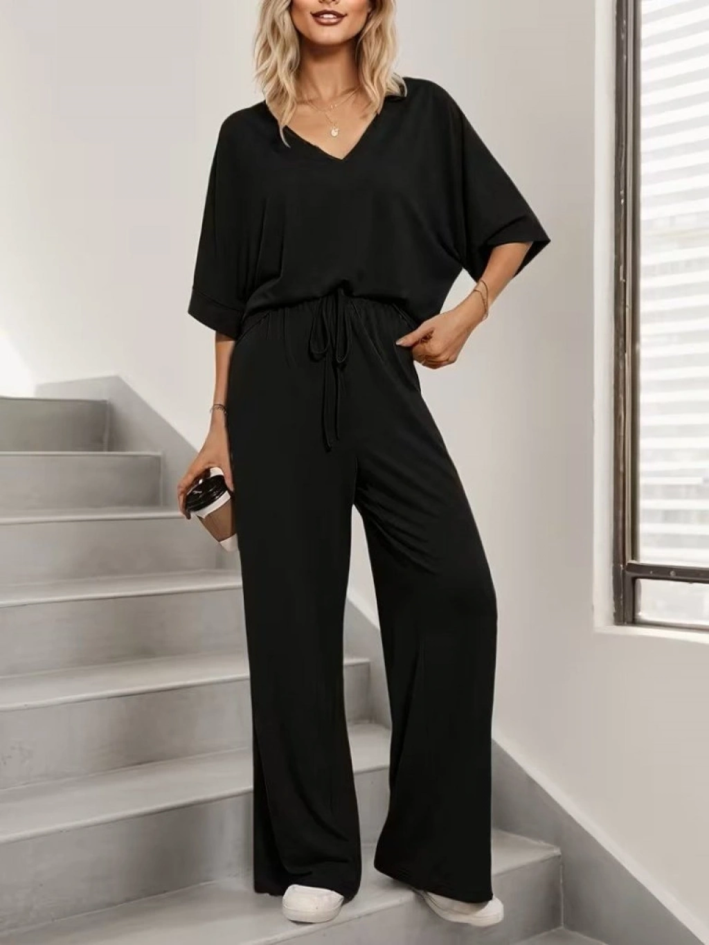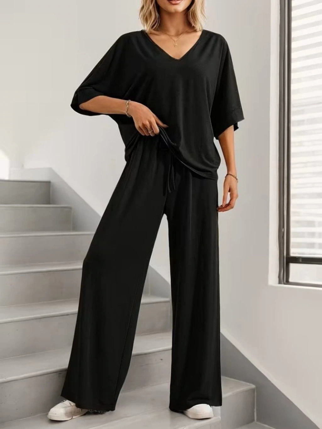 Kadın Kısa Kollu V Yakalı Viskon Bluz Ve Pantolon Ikili Takım