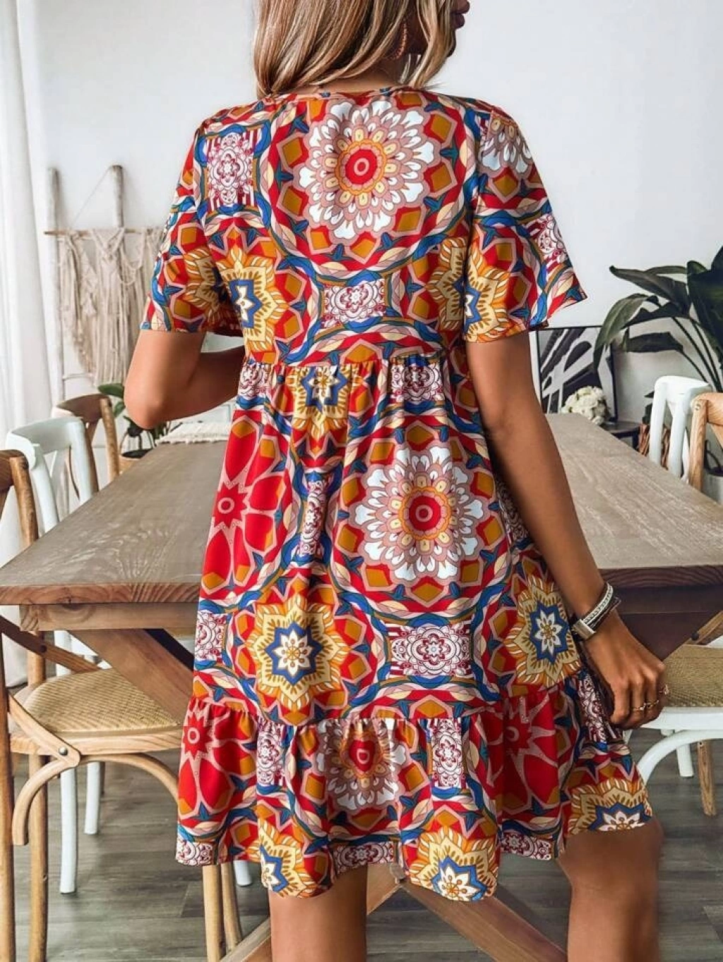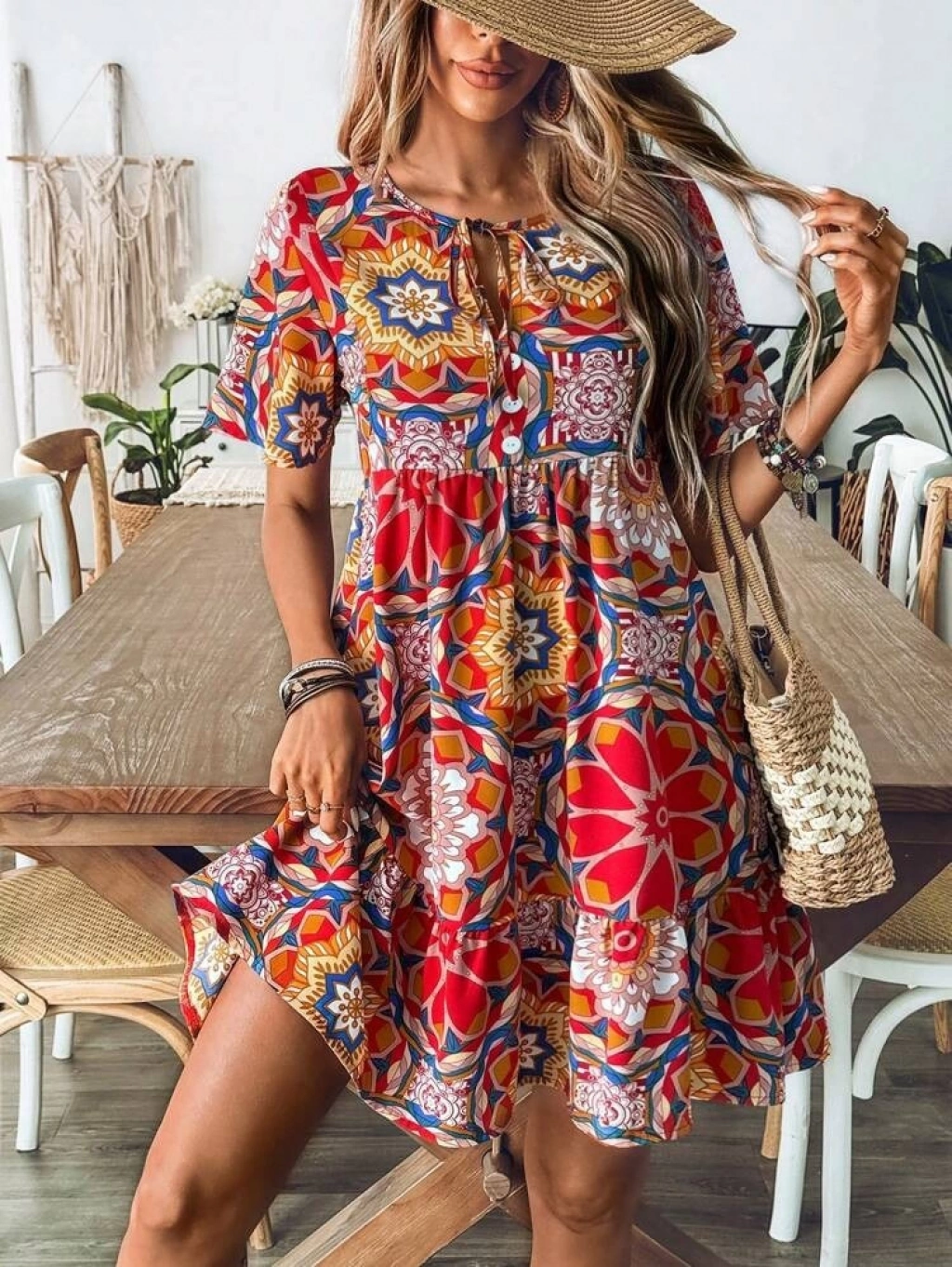Kadın Kısa Kollu Yakadan Bağcıklı Desenli Fırfırlı Süprem Elbise