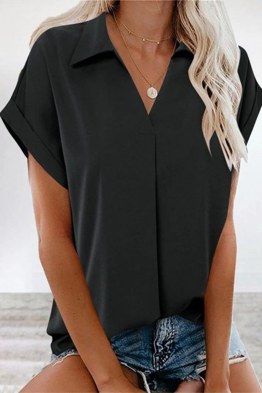 Kadın Kısa Kollu Yakalı Dokuma Viskon Bluz