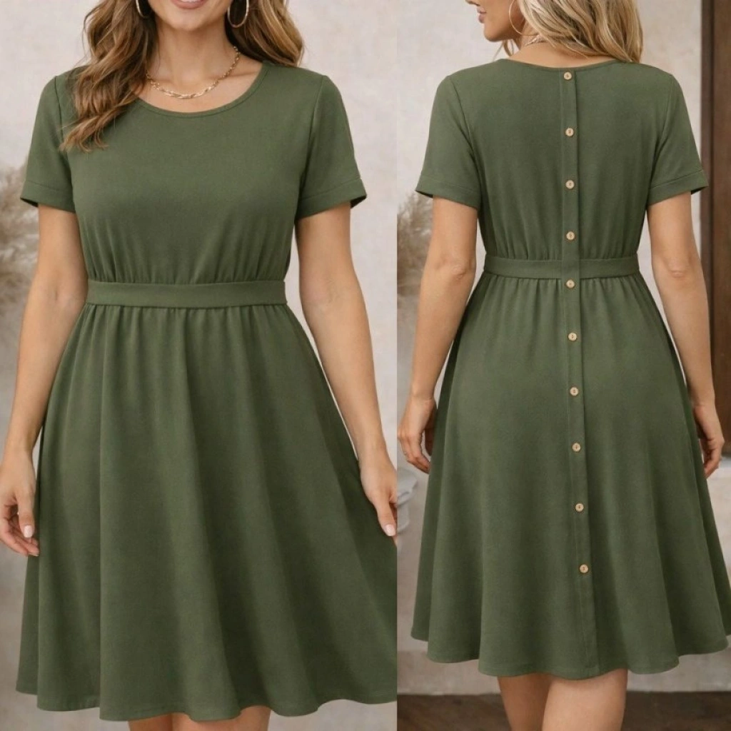 Kadın Kısa Kollu Yuvarlak Yaka Arkadan Düğmeli Viskon Midi Elbise