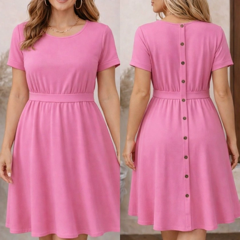 Kadın Kısa Kollu Yuvarlak Yaka Arkadan Düğmeli Viskon Midi Elbise