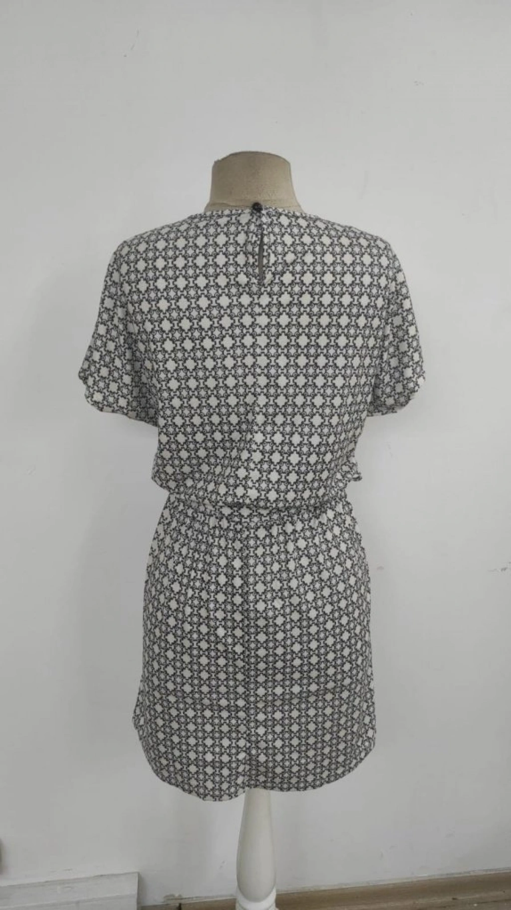 Kadın Kısa Kollu Yuvarlak Yaka Beli Kuşaklı Geometrik Desenli Süprem Elbise