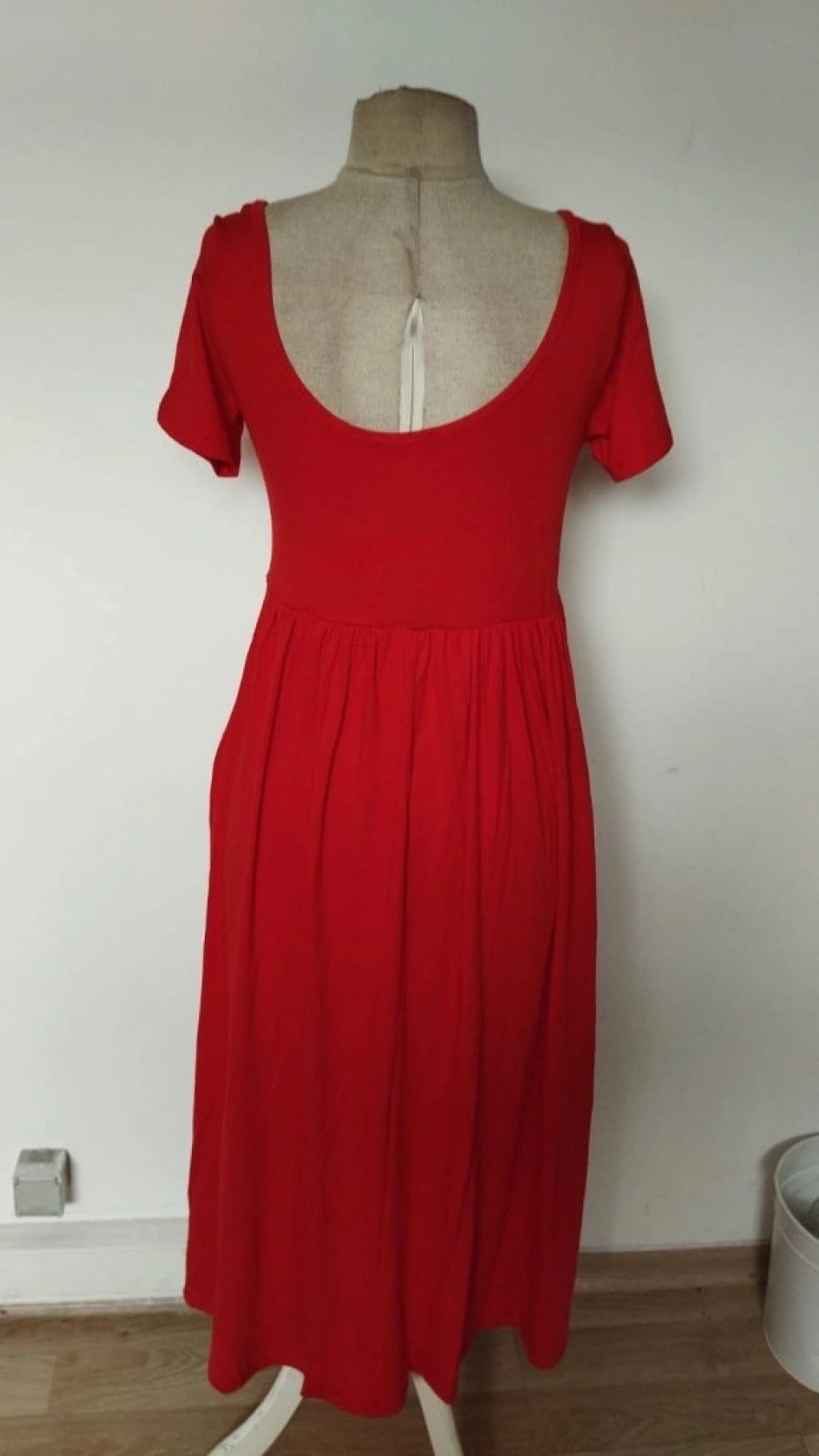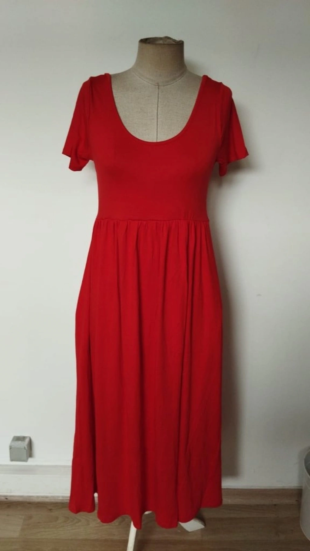 Kadın Kısa Kollu Yuvarlak Yaka önden Yırtmaçlı Cepli Viskon Uzun Elbise