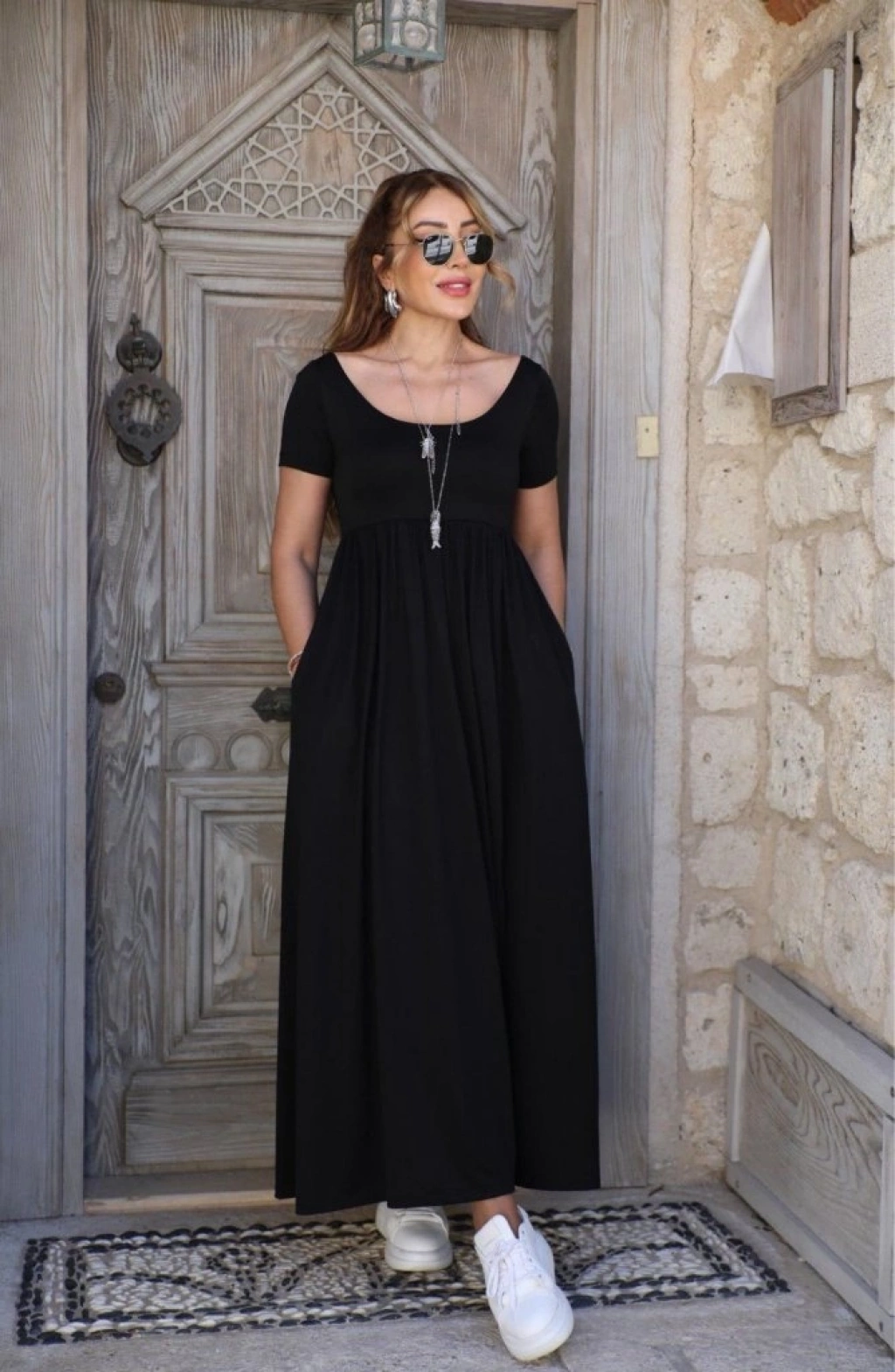 Kadın Kısa Kollu Yuvarlak Yaka önden Yırtmaçlı Cepli Viskon Uzun Elbise