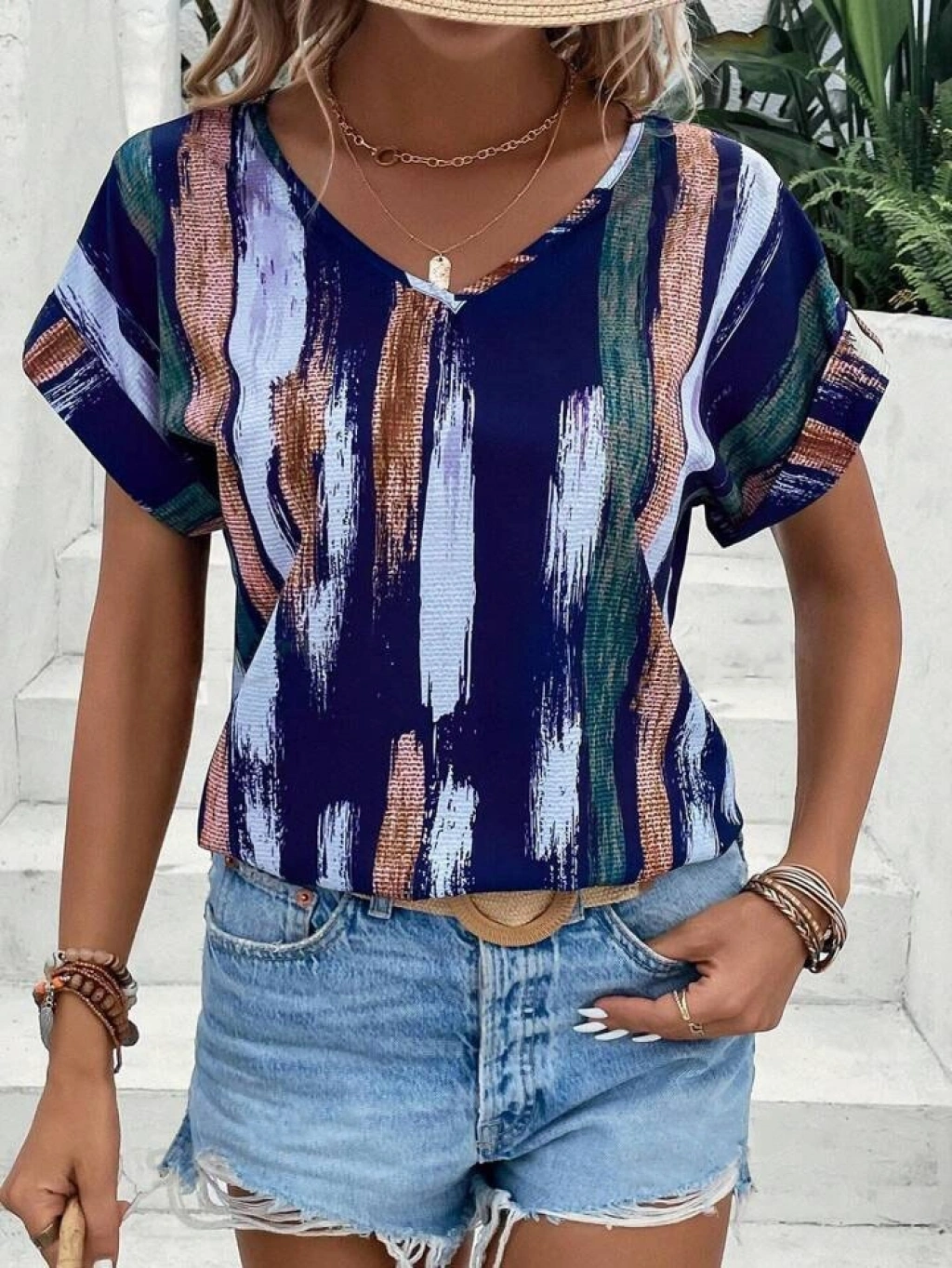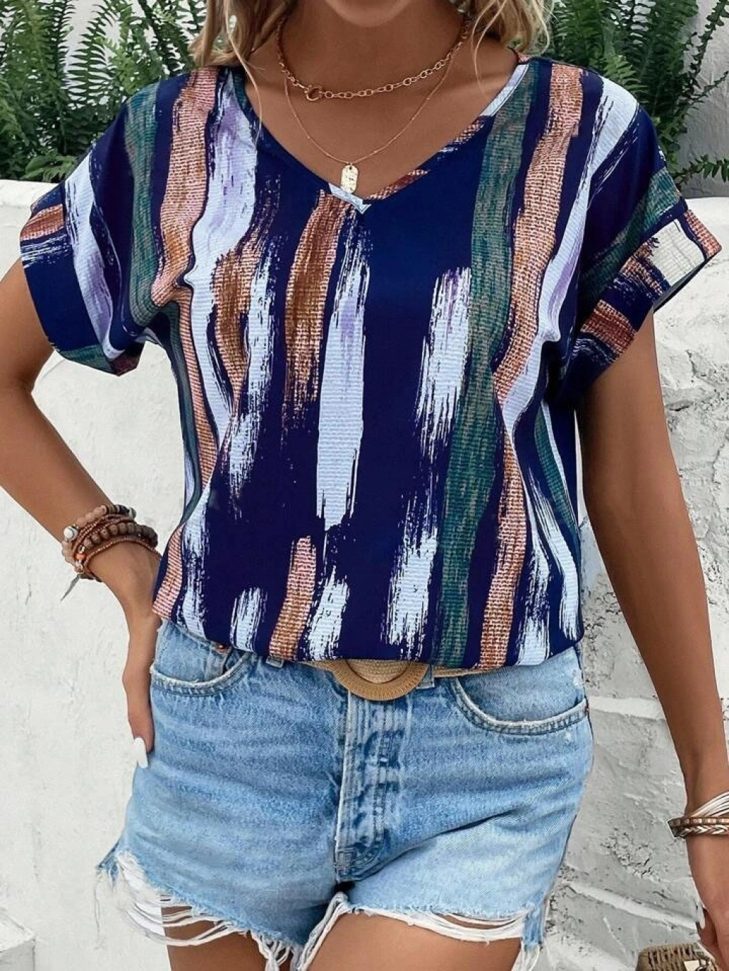 Kadın Kısa Yarasa Kol Fırça Desenli V Yaka Süprem Bluz