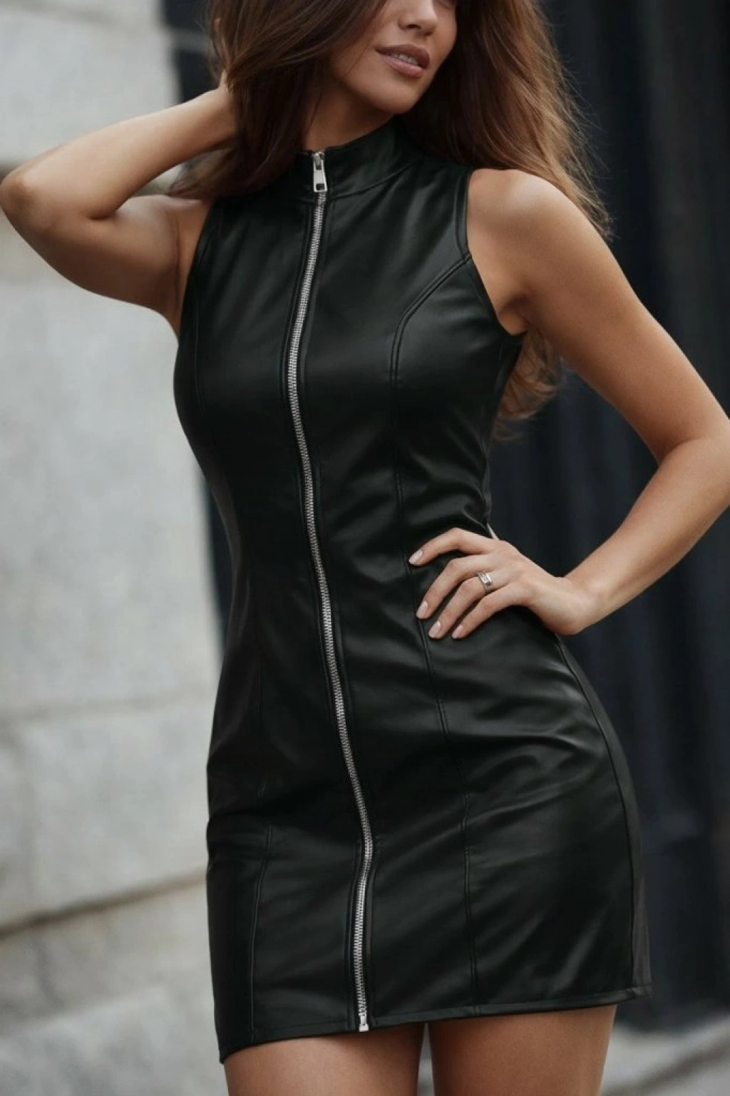 Kadın Kolsuz Balıkçı Yaka önden Fermuarlı Kısa Deri Elbise
