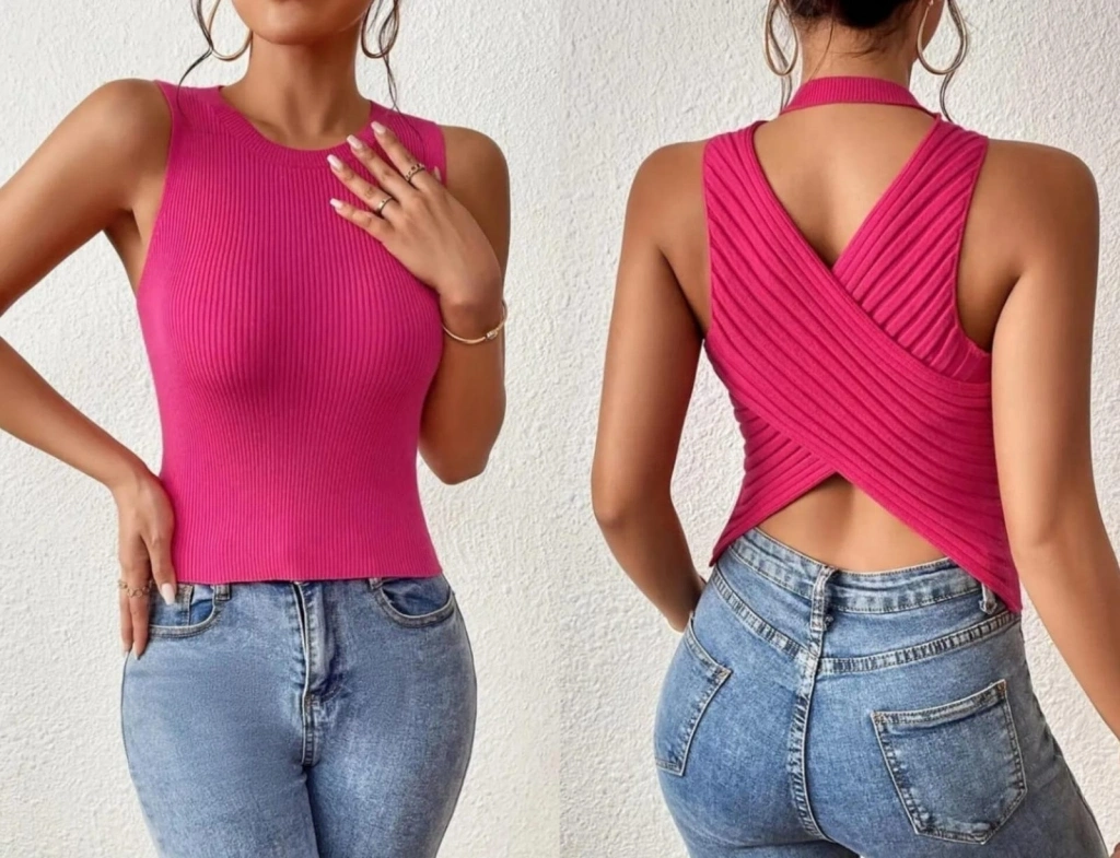 Kadın Kolsuz Sırt çapraz Detay Triko Bluz