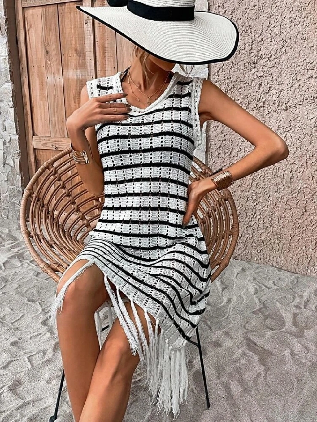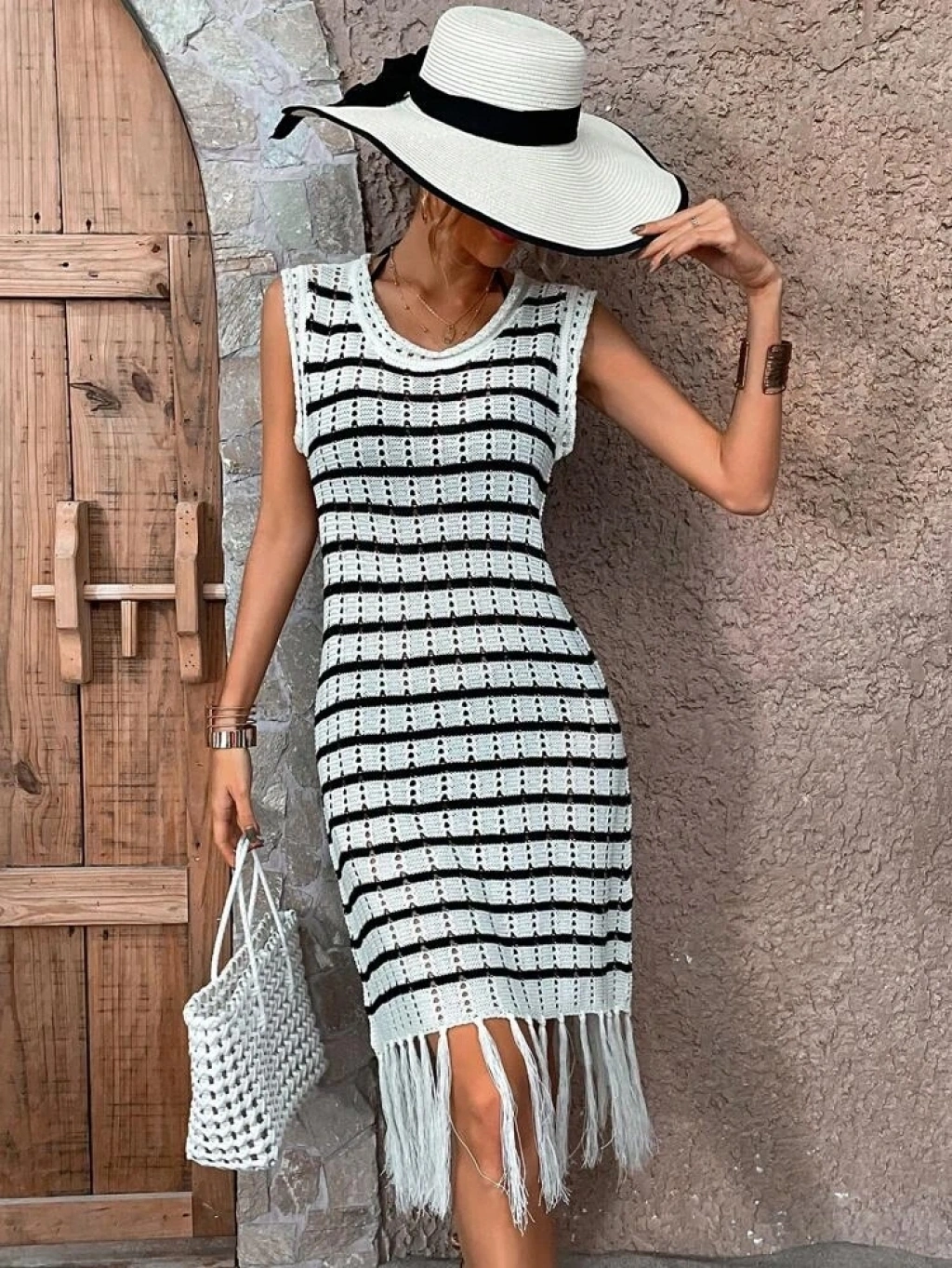 Kadın Kolsuz V Yaka Eteği Püsküllü çizgi Desen Elbise