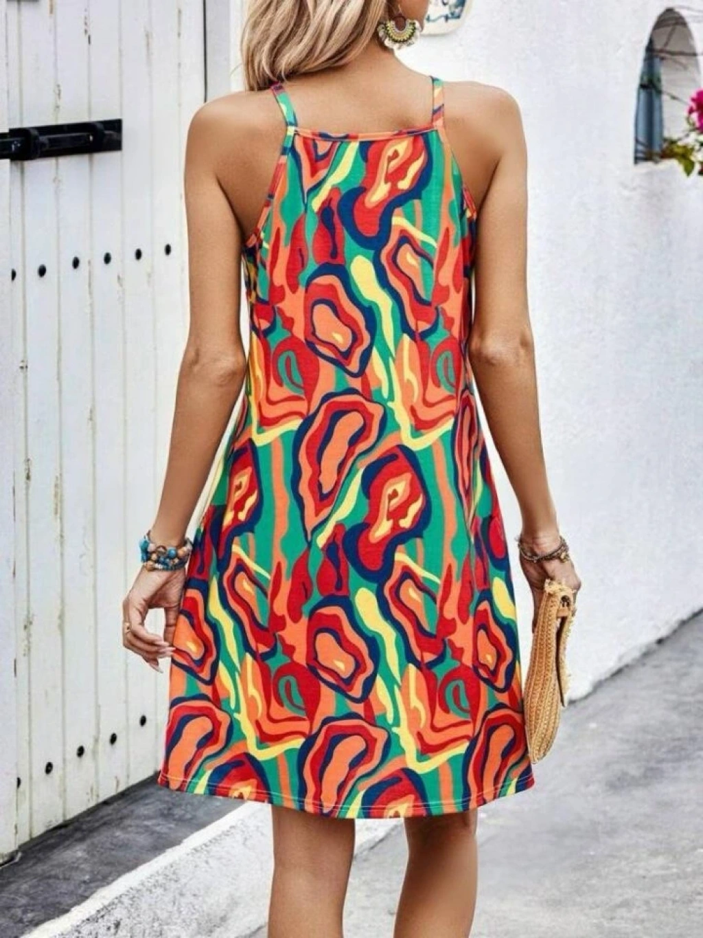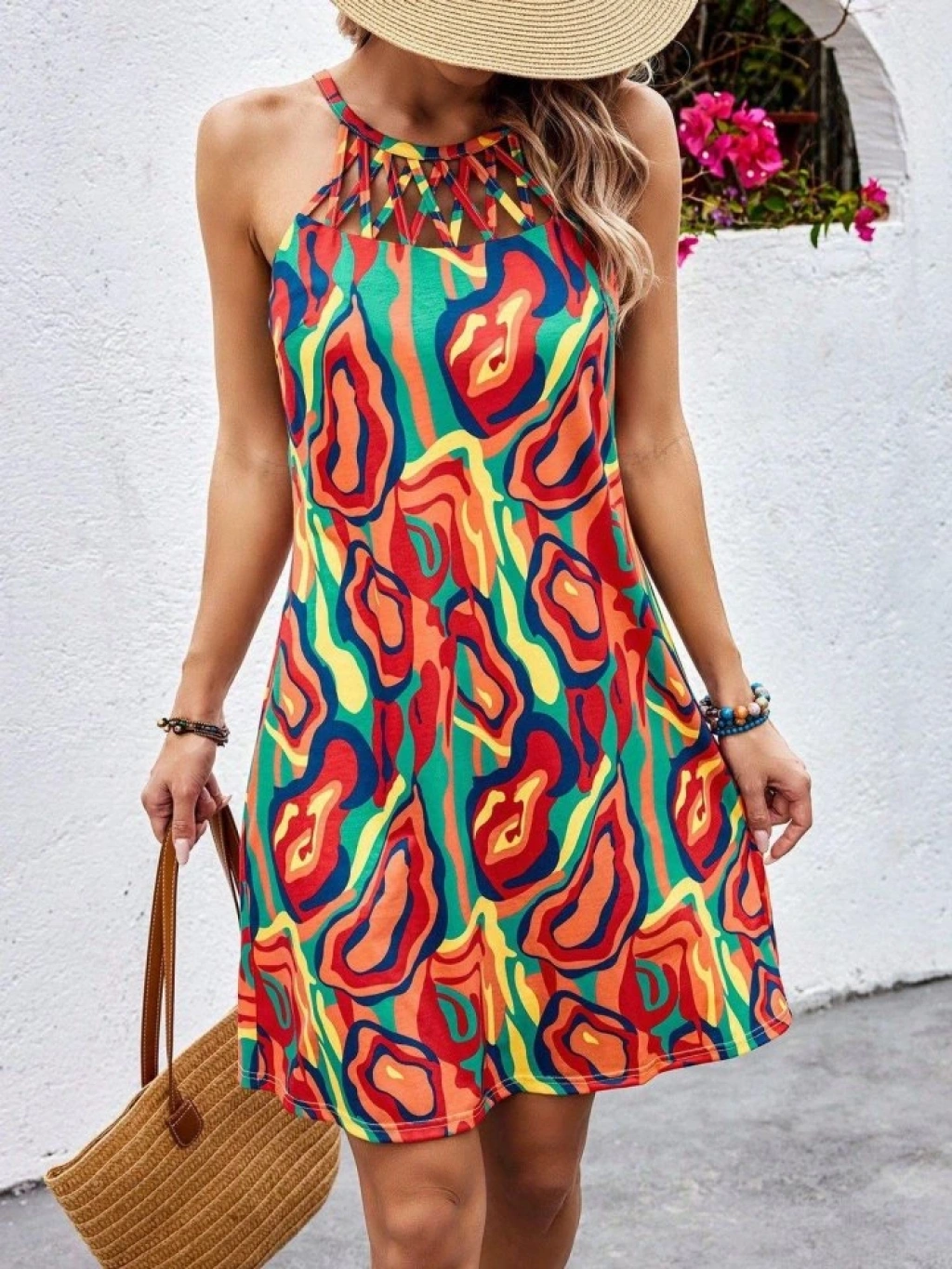 Kadın Kolsuz Yuvarlak Yaka önden çapraz şerit Detay çok Renkli Baskılı Süprem Kısa Elbise