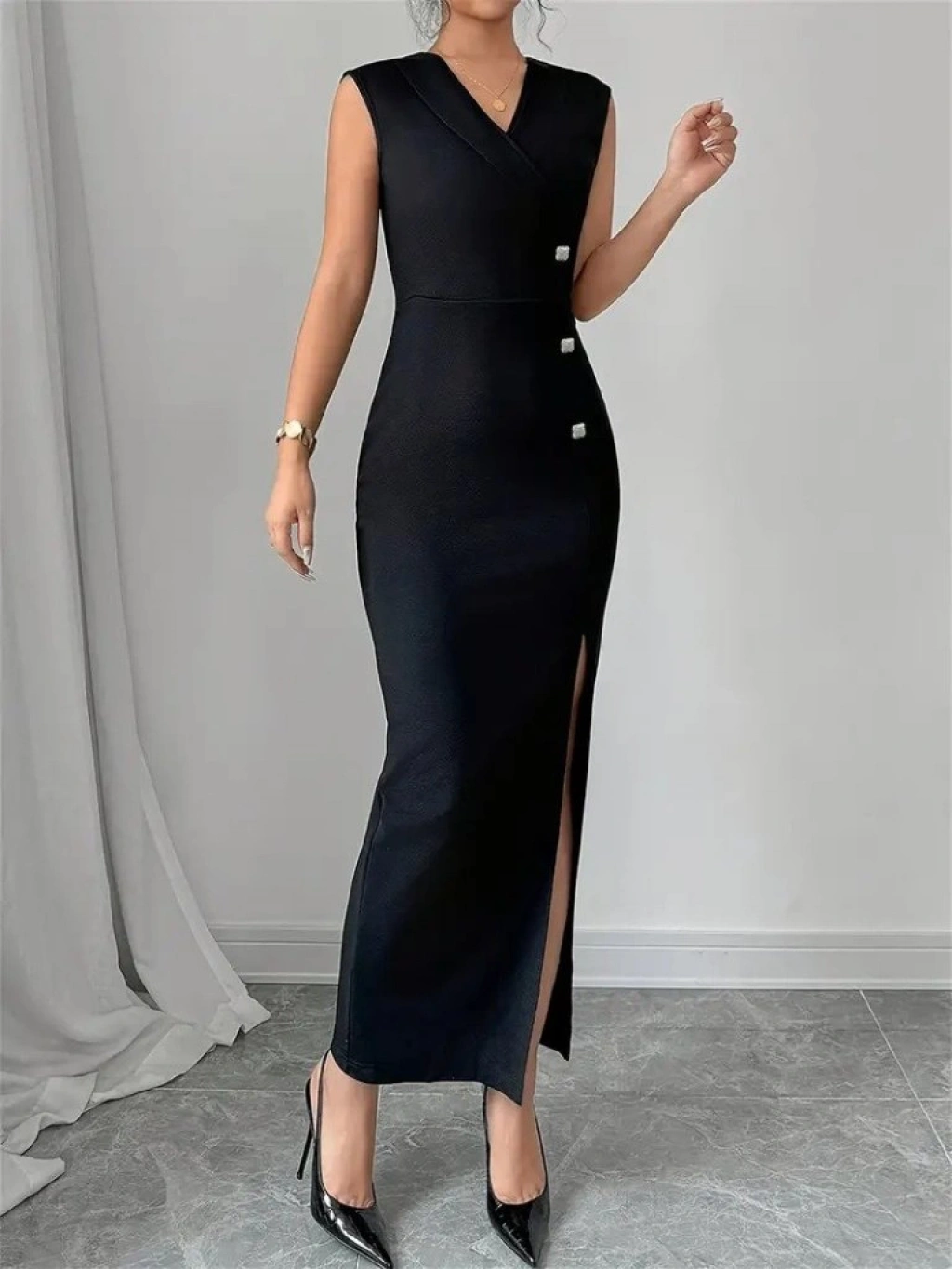 Kadın Kruvaze Yakalı Yandan Düğmeli Yırtmaç Detaylı Uzun Ithal Krep Elbise