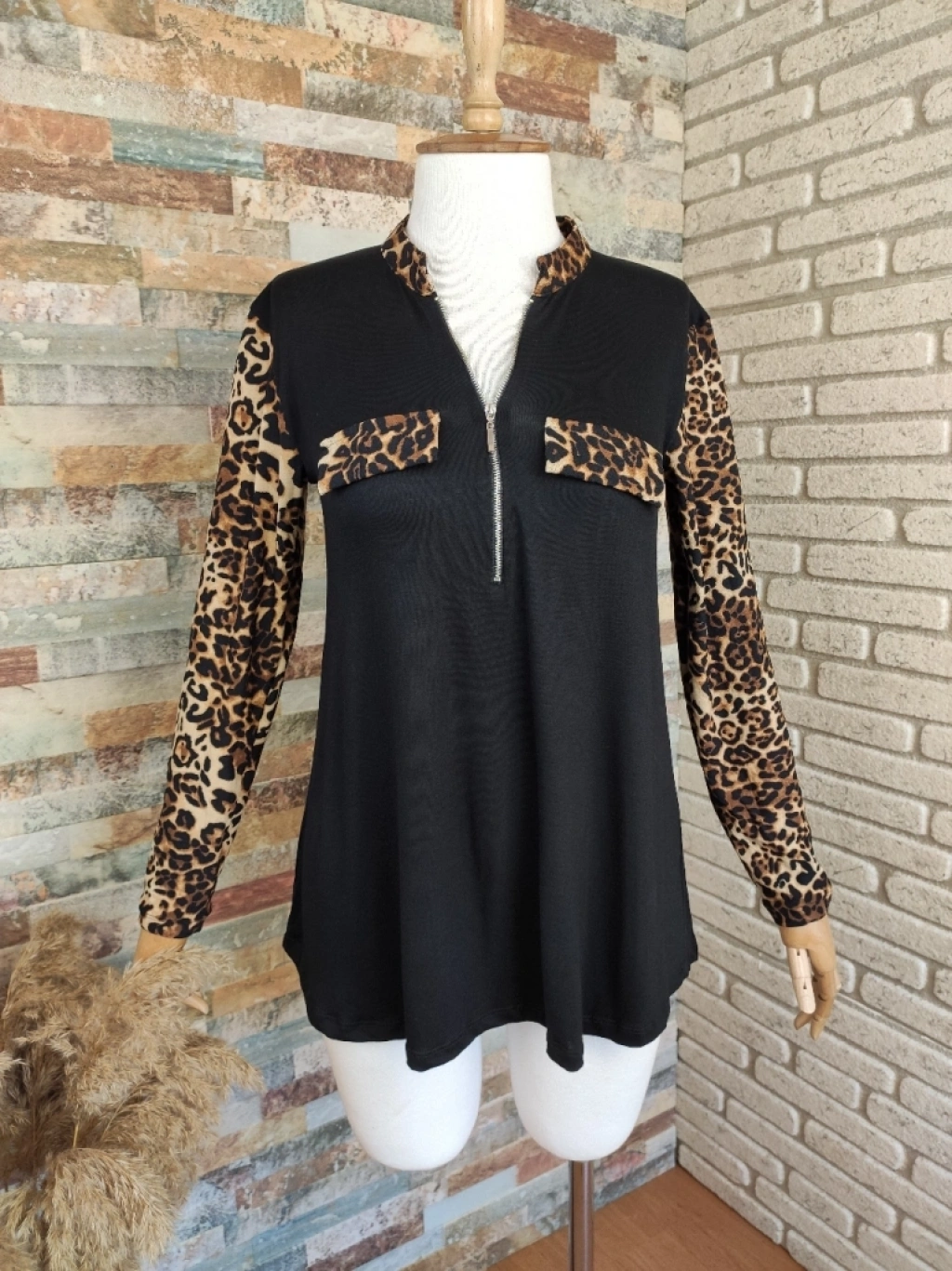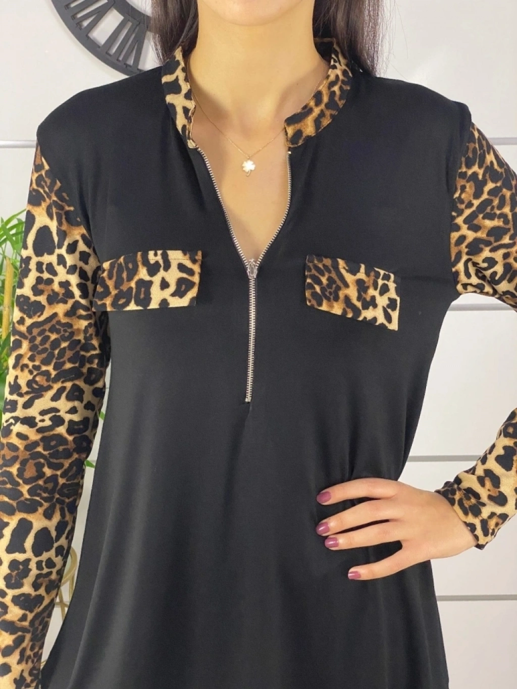 Kadın Leopar Desen Fermuar Detay Viskon Kumaş Bluz
