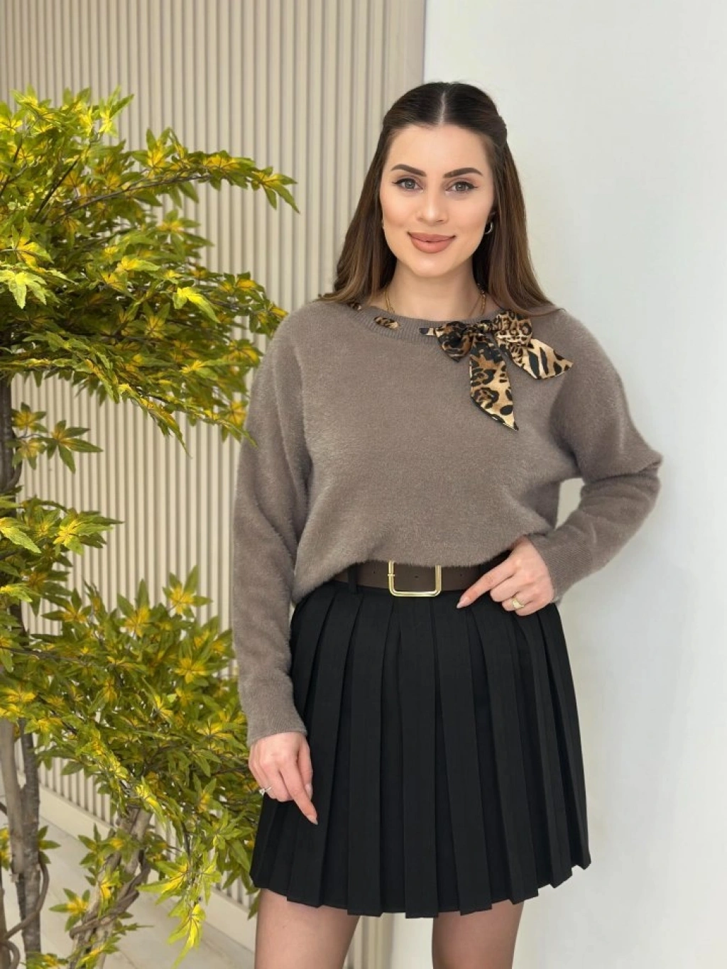 Kadın Leopar Desen Flar Detay Bisiklet Yaka Triko Kazak
