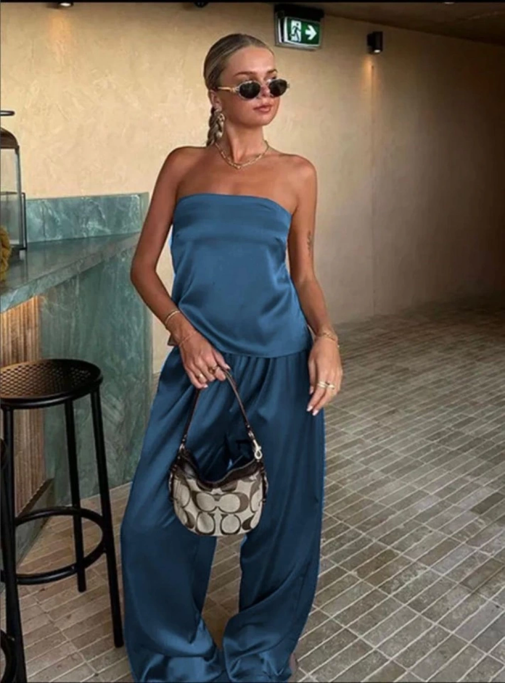 Kadın Likralı Saten Kumaş Straplez Bağlamalı Ikili Takım