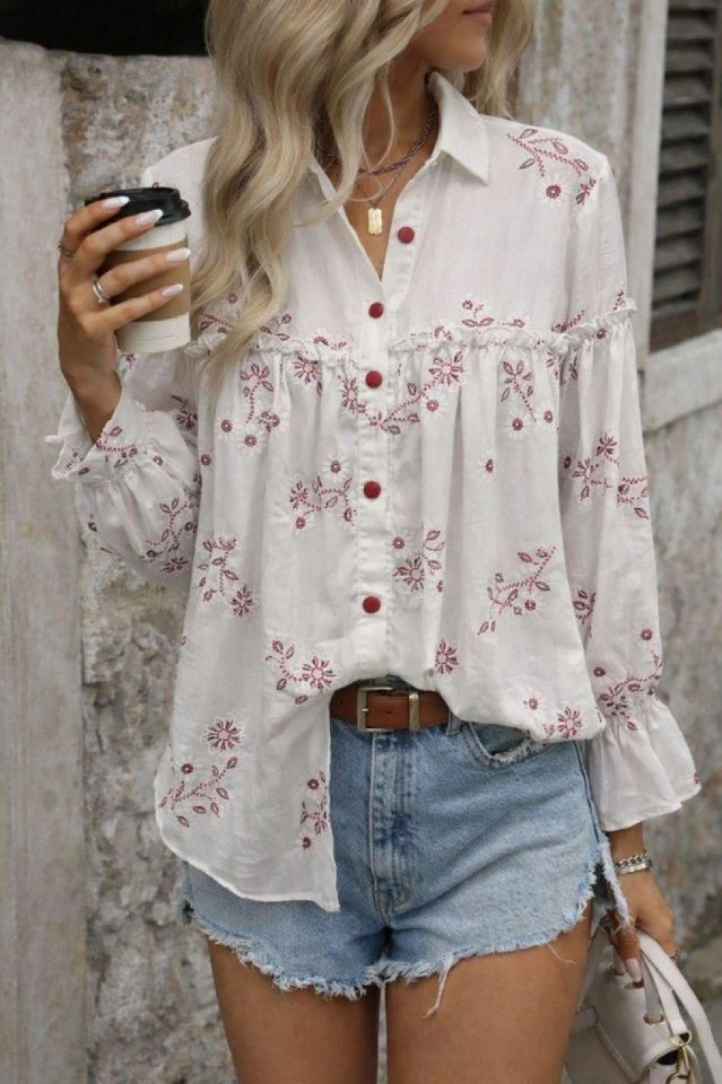 Kadın Nakış Işlemeli Kolu Volanlı Gömlek