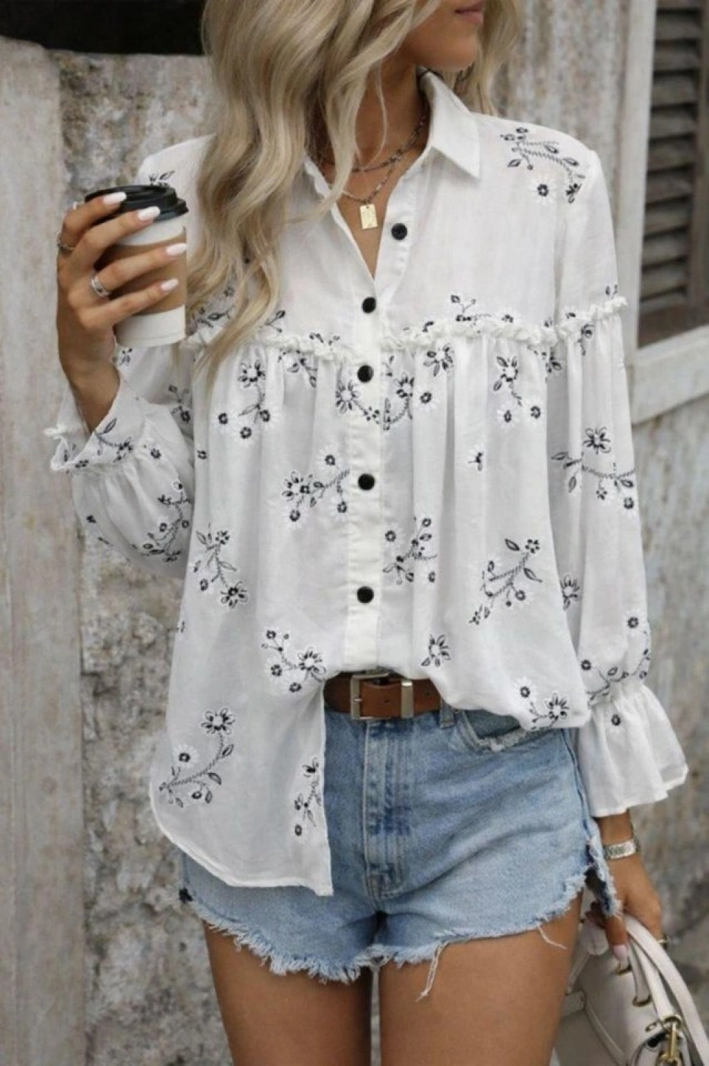Kadın Nakış Işlemeli Kolu Volanlı Gömlek