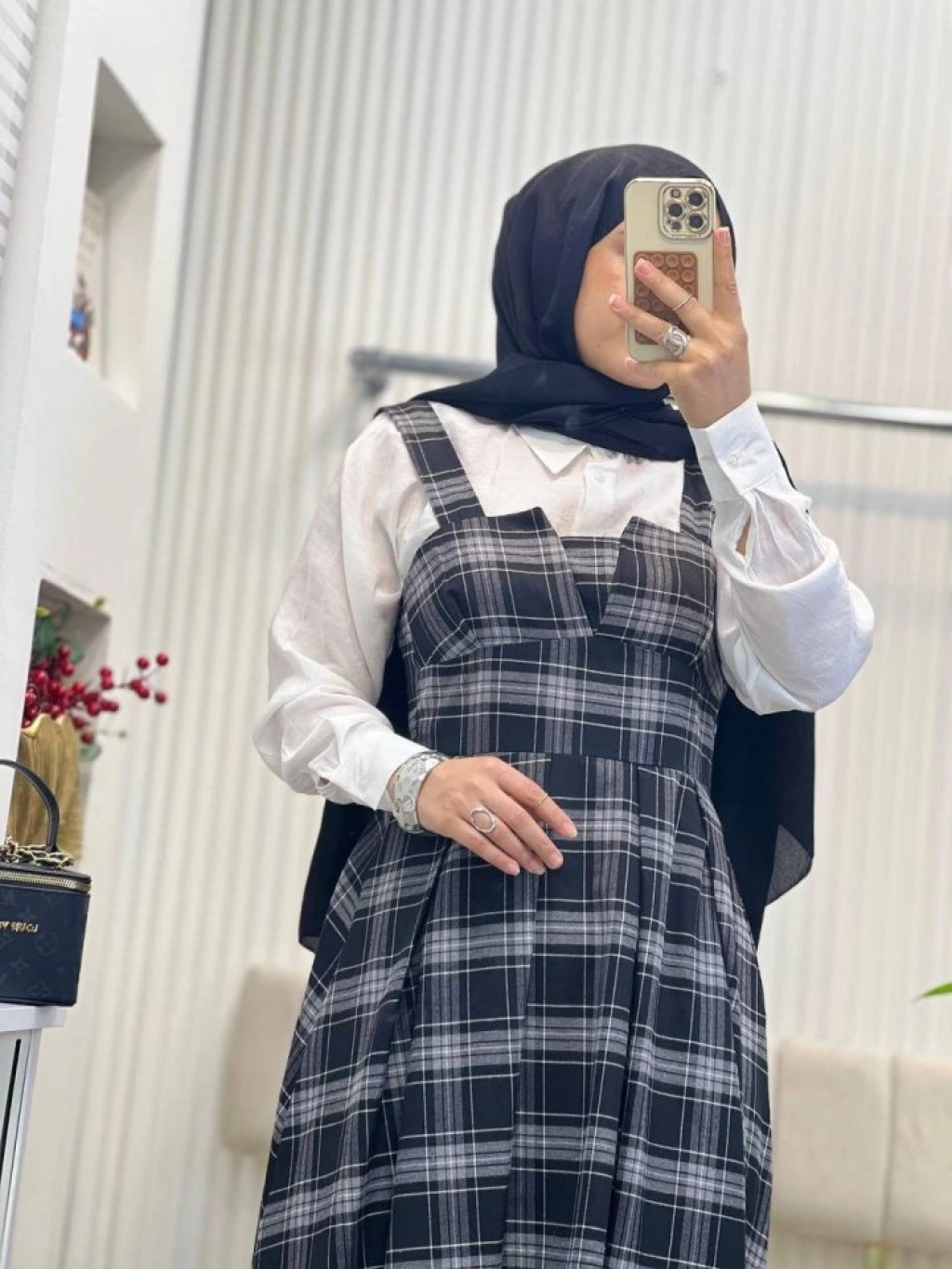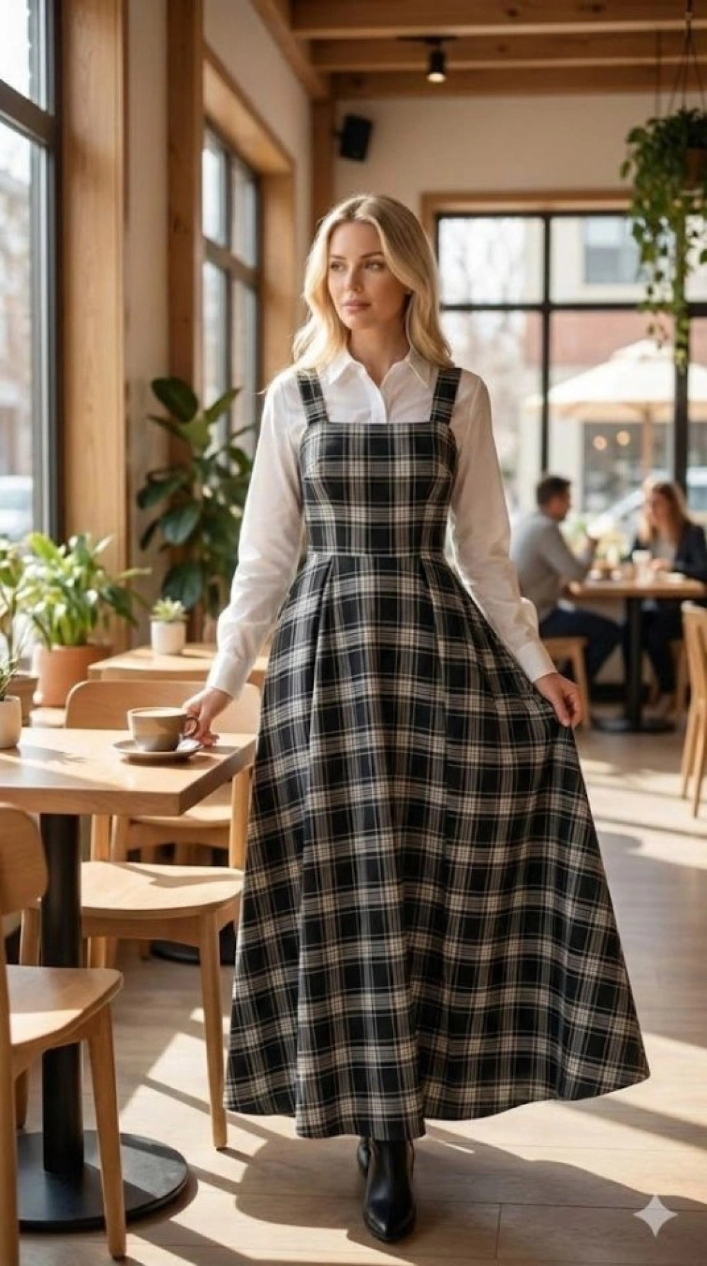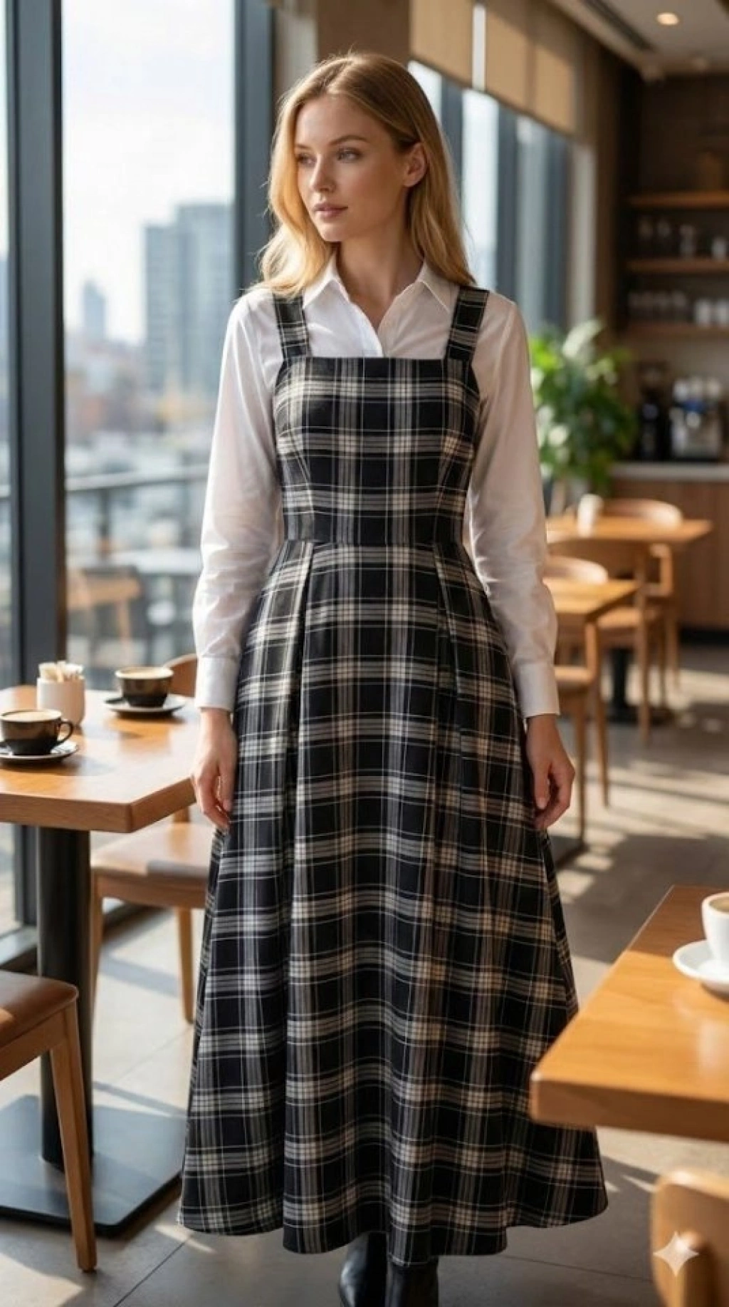 Kadın Omuz Askılı Full Ekose Detay Elbise