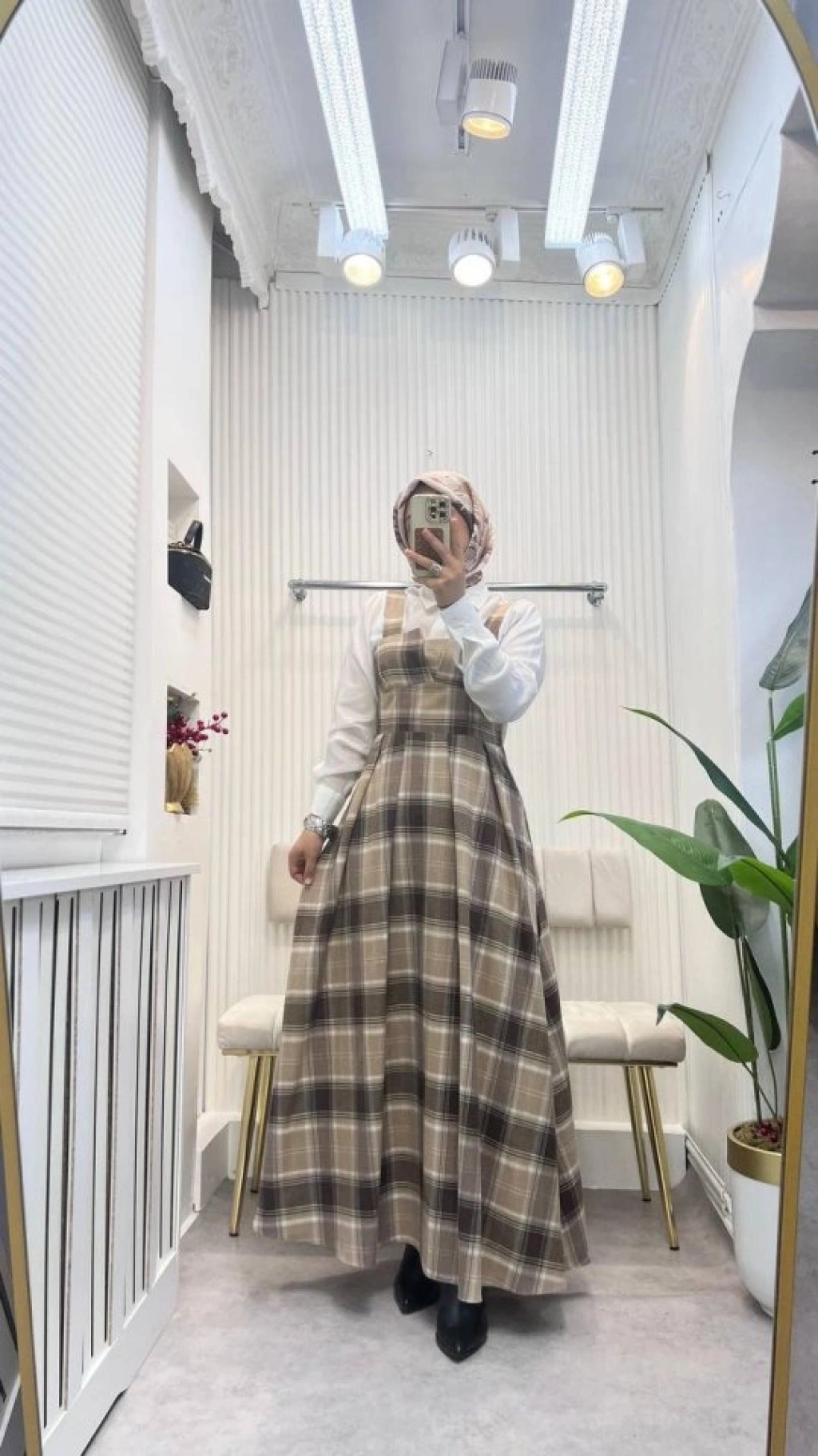Kadın Omuz Askılı Full Ekose Detay Elbise