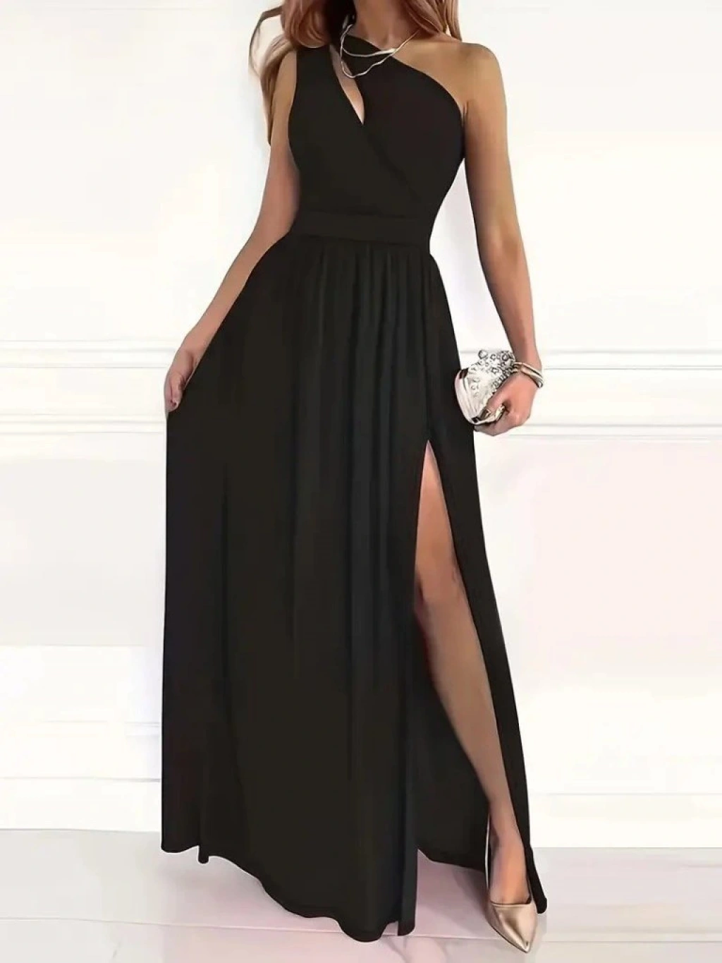 Kadın Omuzlardan Açık Asimetrik Yaka Detaylı Yırtmaçlı Maksi Boy Janjan Krep Elbise