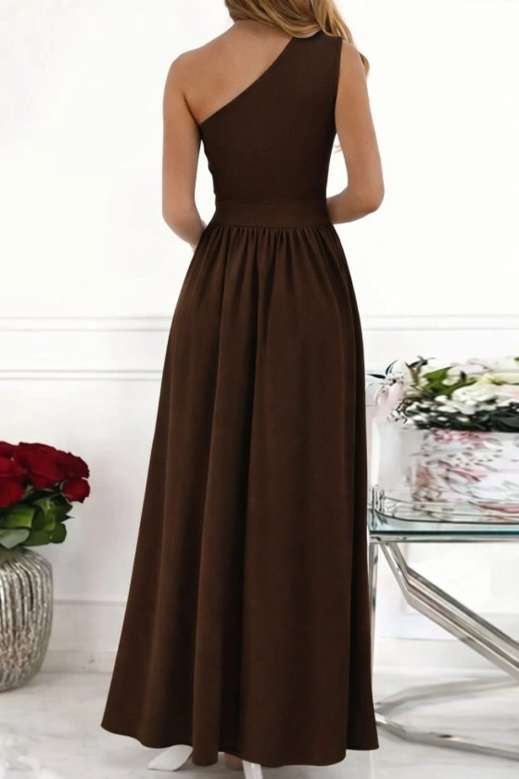 Kadın Omuzlardan Açık Asimetrik Yaka Detaylı Yırtmaçlı Maksi Boy Janjan Krep Elbise