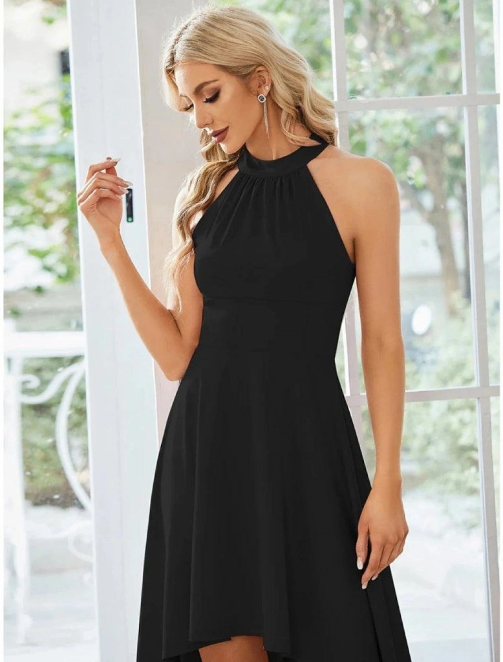 Kadın Omuzlardan Açık Boyundan Halka Detaylı Görünümlü Asimetrik Detaylı Kısa Ithal Krep Elbise