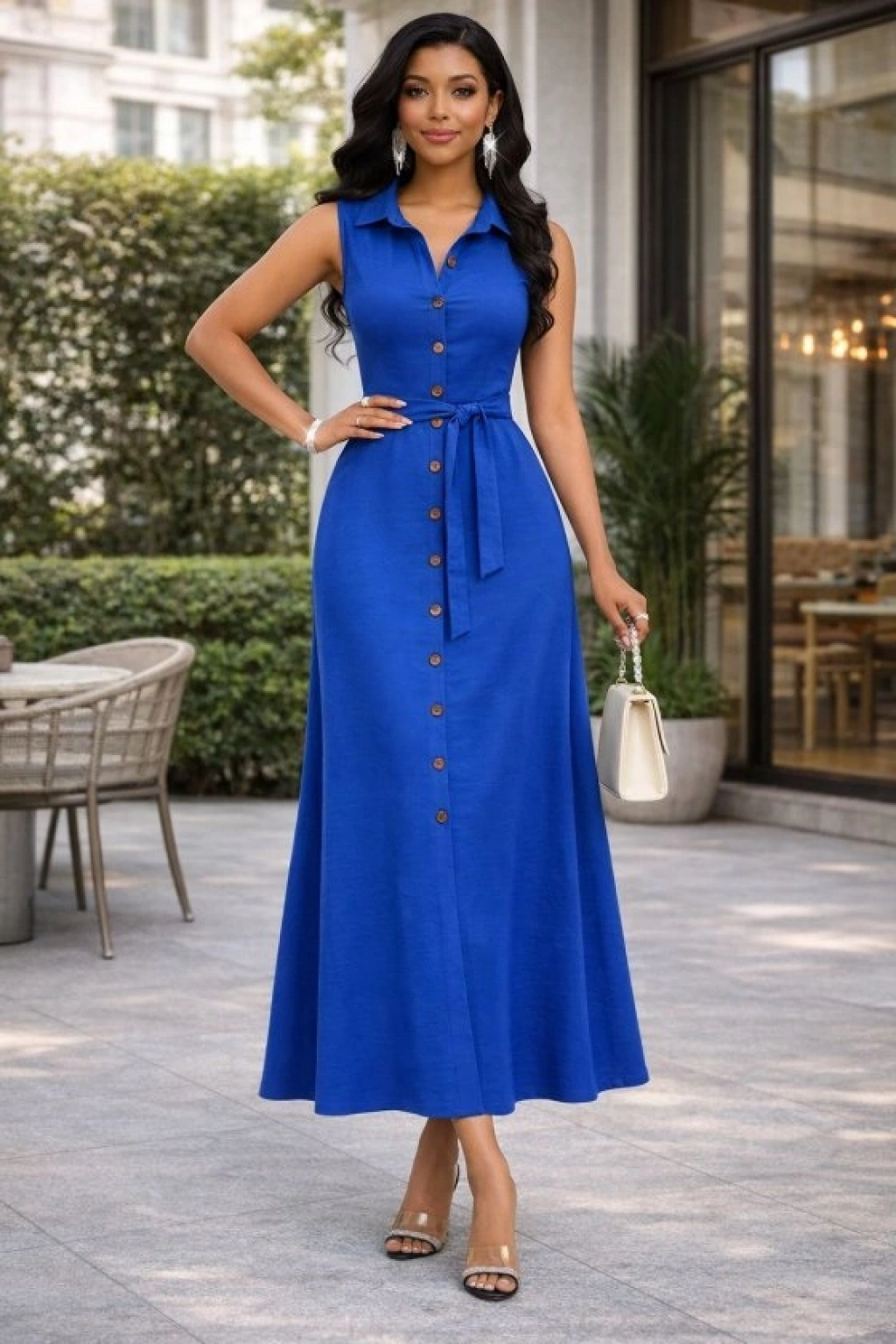 Kadın önden Düğmeli Beli Kuşaklı Maxi Boy Aerobin Kumaş Gömlek Elbise