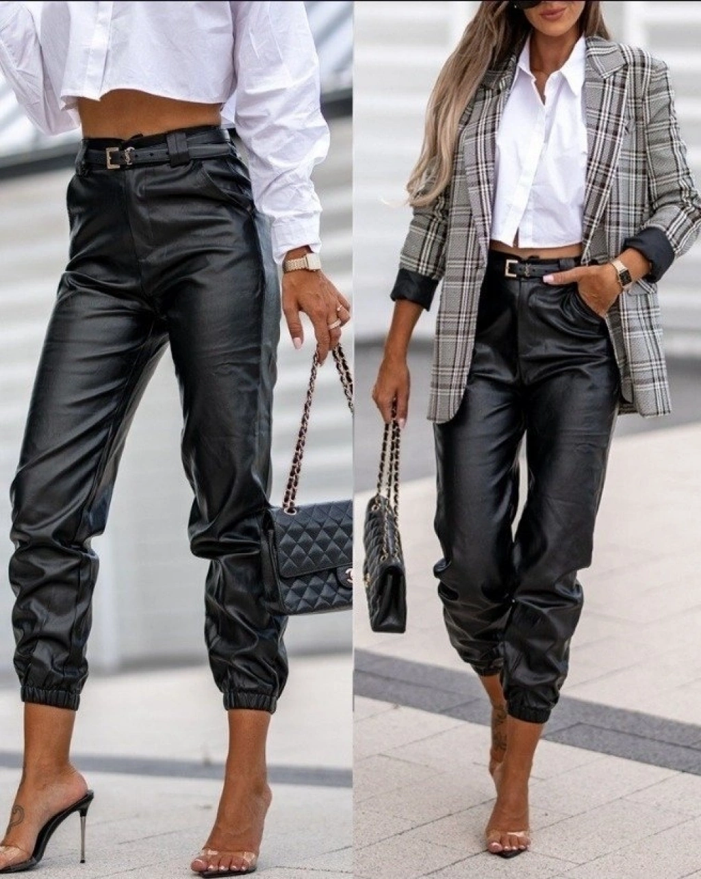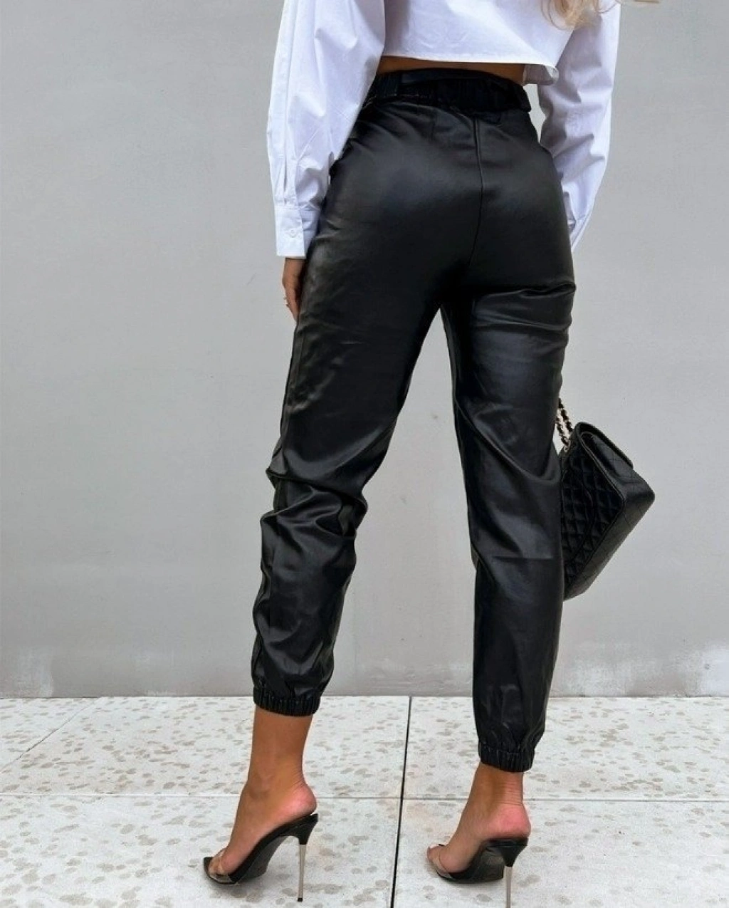 Kadın Pantolon Paçası Lastikli Deri Pantolon (kemersiz)