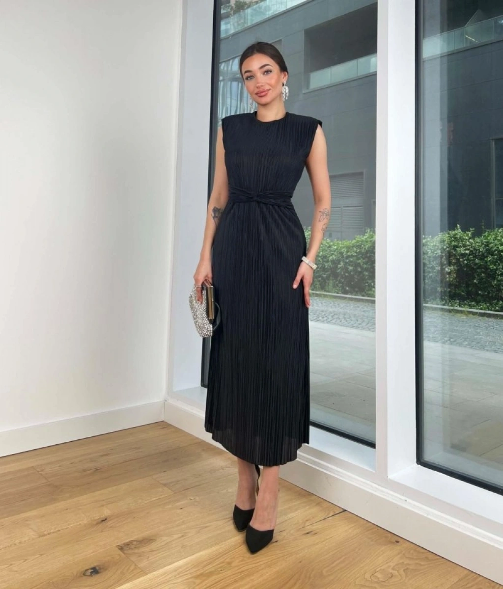 Kadın Plise Kumaş Bel Detaylı Midi Boy Elbise