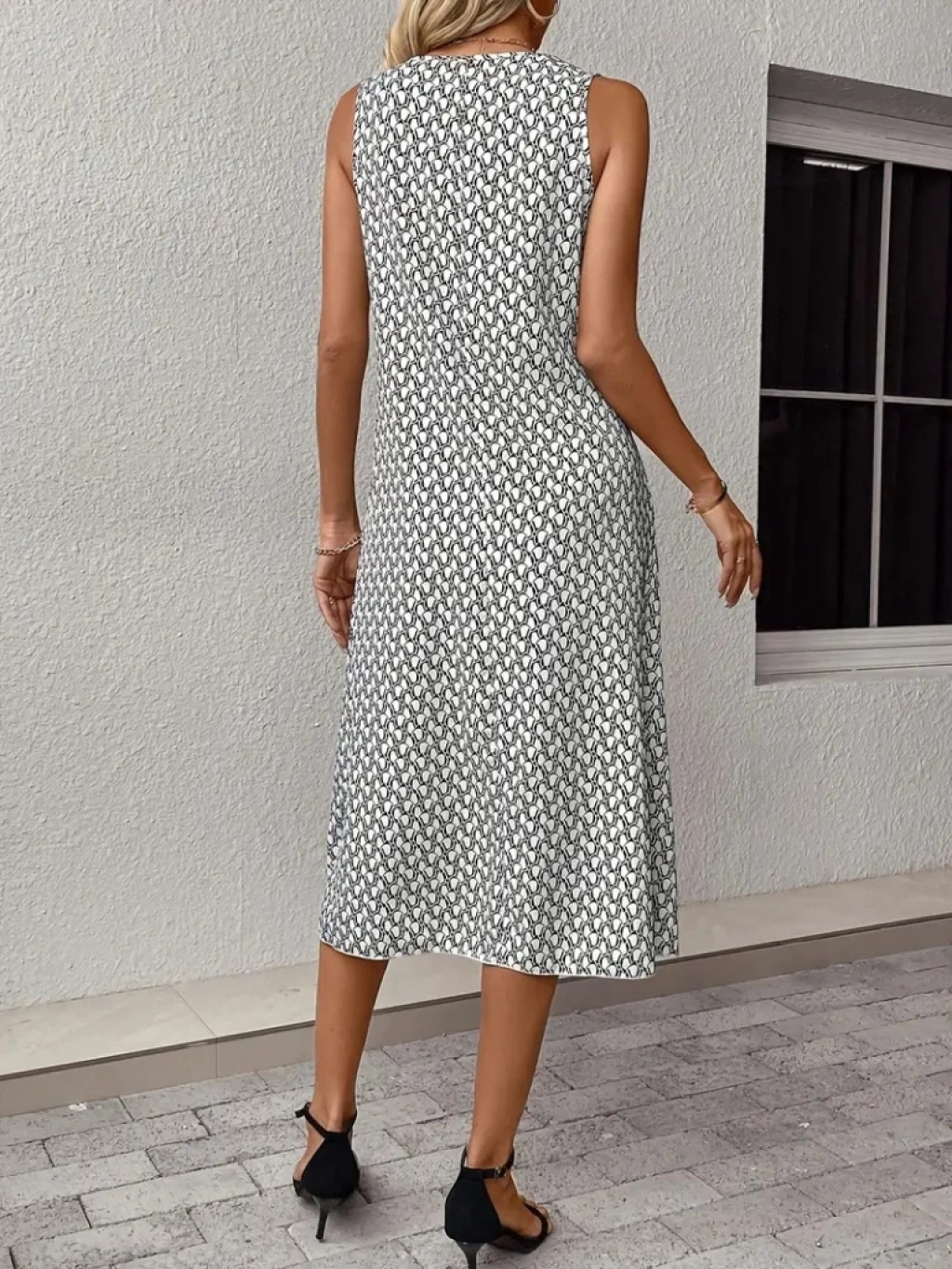 Kadın Sıfır Kol Bisiklet Yaka Desenli Midi Boy Sandy Elbise
