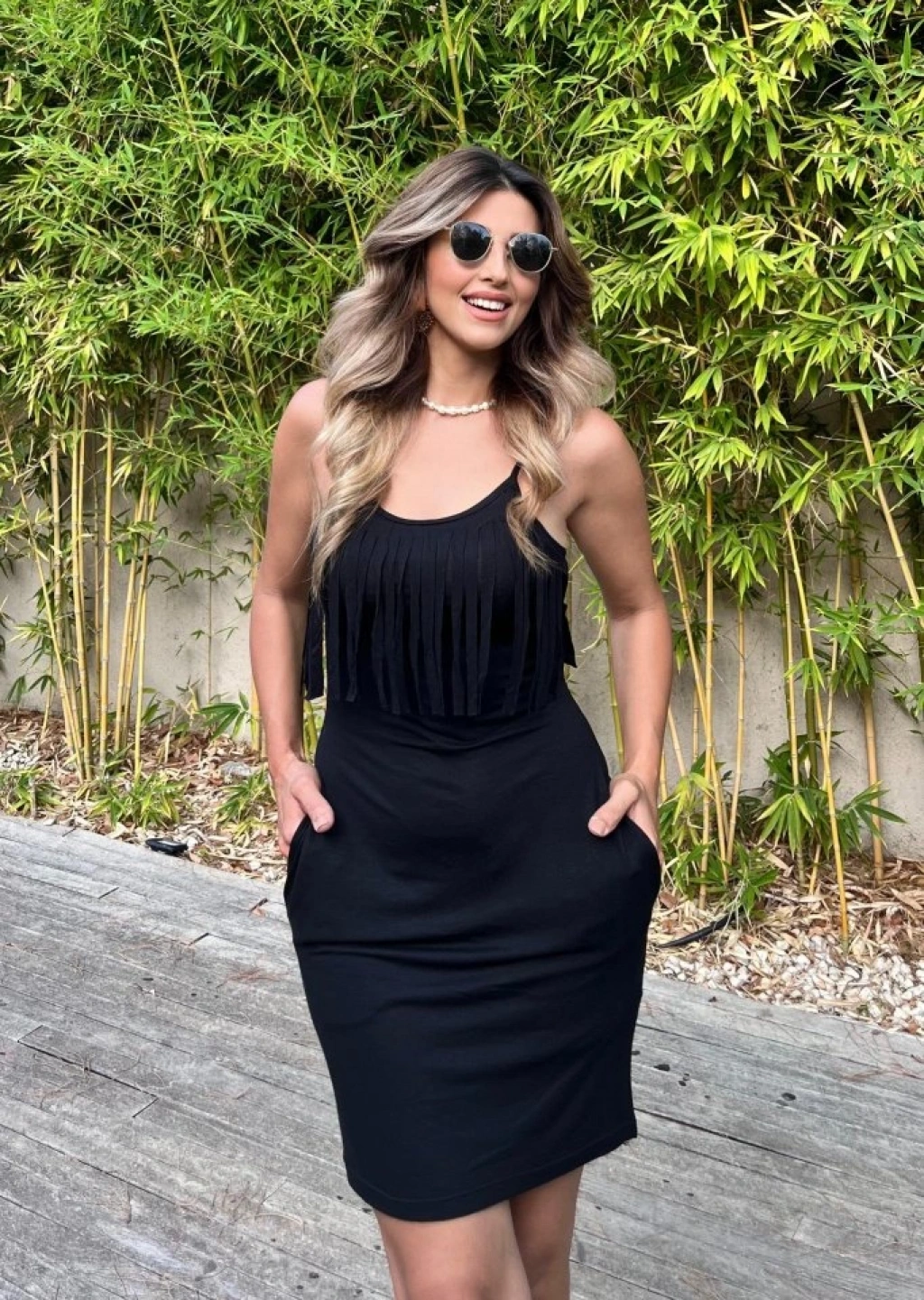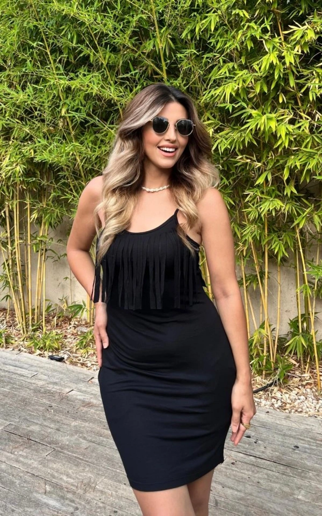 Kadın Sıfır Kol önü Püsküllü Askılı Viskon Mini Elbise