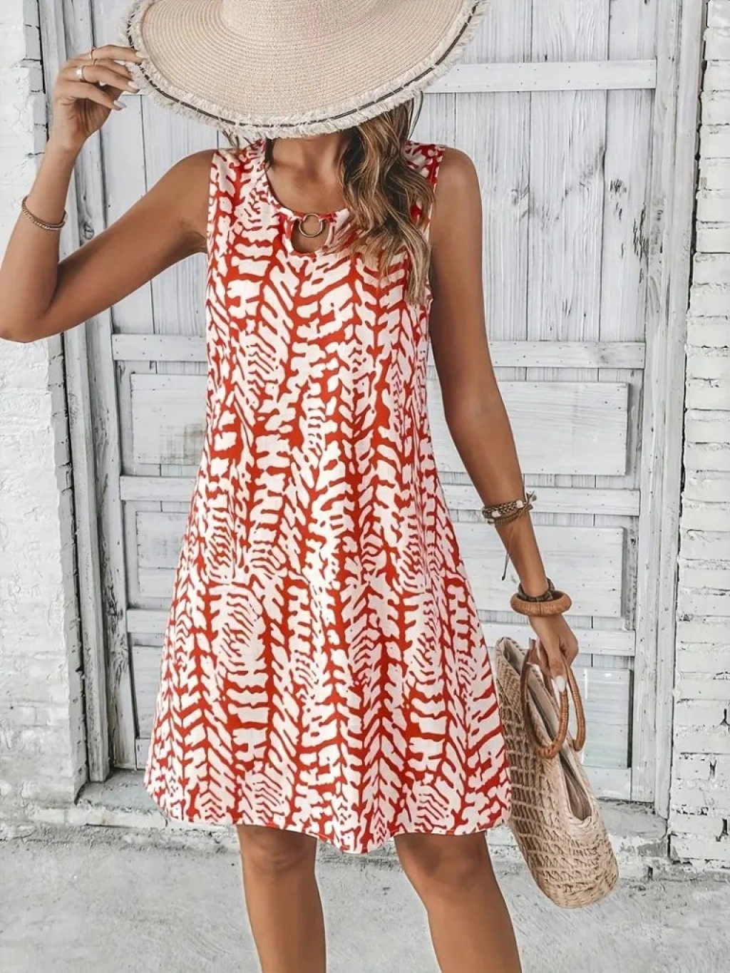 Kadın Sıfır Kol Yakadan Halka Detaylı Desenli Kısa Bürümcük Elbise