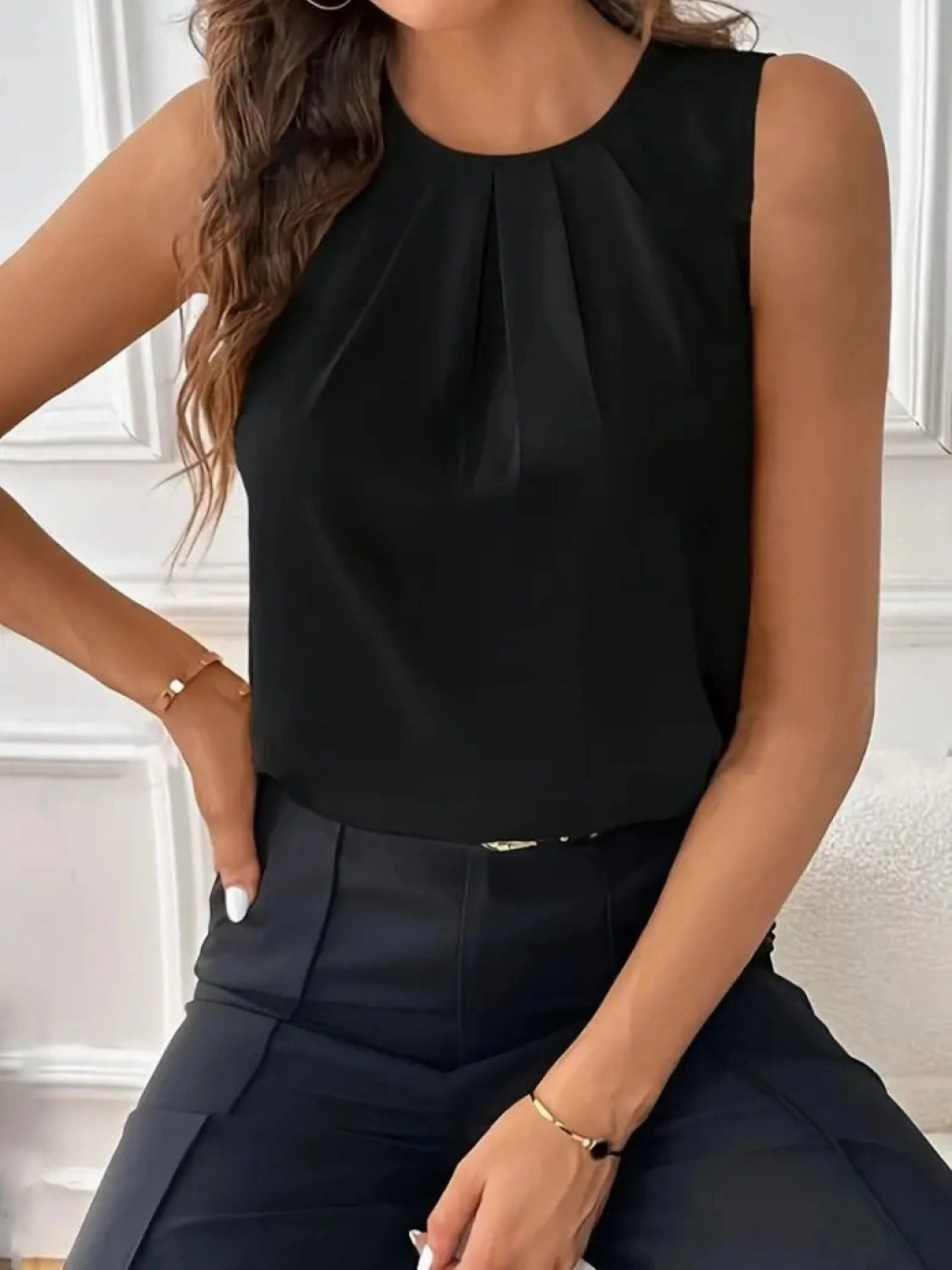 Kadın Sıfır Kollu Bisiklet Yaka önden Pileli Ithal Krep Bluz