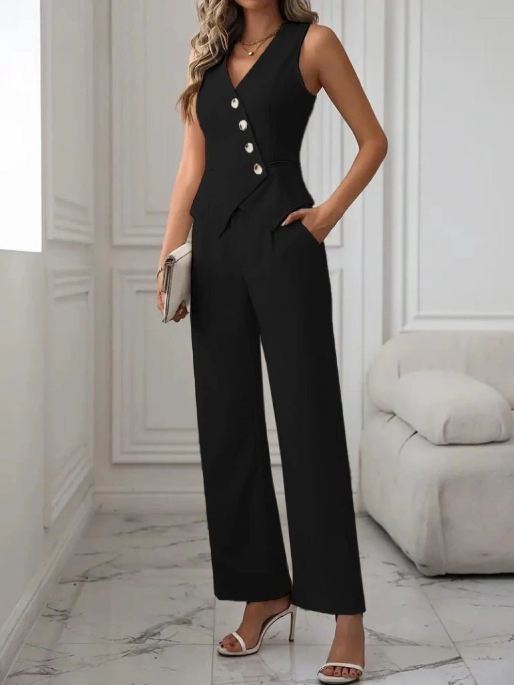 Kadın Sıfır Kollu çapraz V Yakalı önden Düğmeli Atlas Yelek Ve Pantolon Ikili Takım