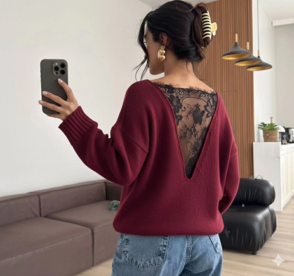 Kadın Sırtı Dantel Transparan Detay Triko Kazak