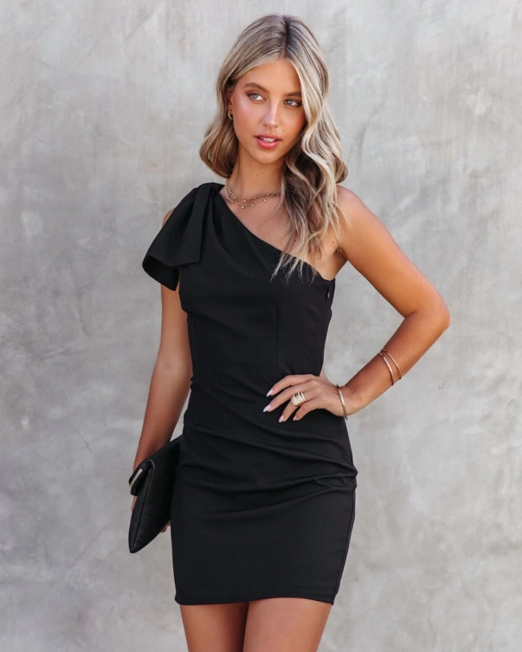 Kadın Tek Omuz Askılı Ek Parça Detay Mini Krep Elbise