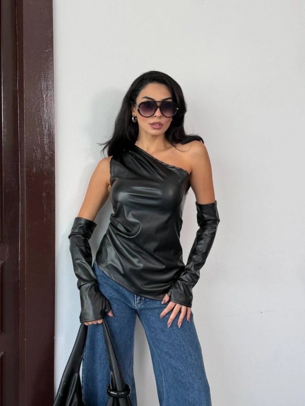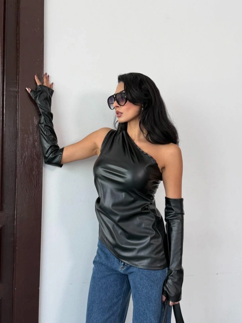 Kadın Tek Omuz Eldiven Detay Deri Bluz