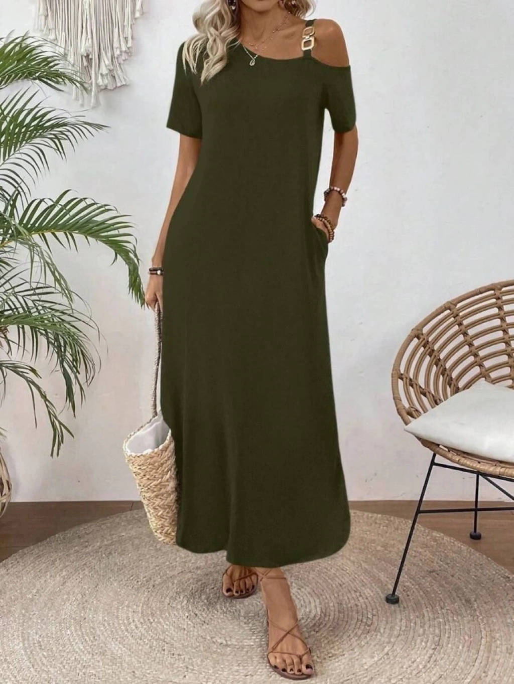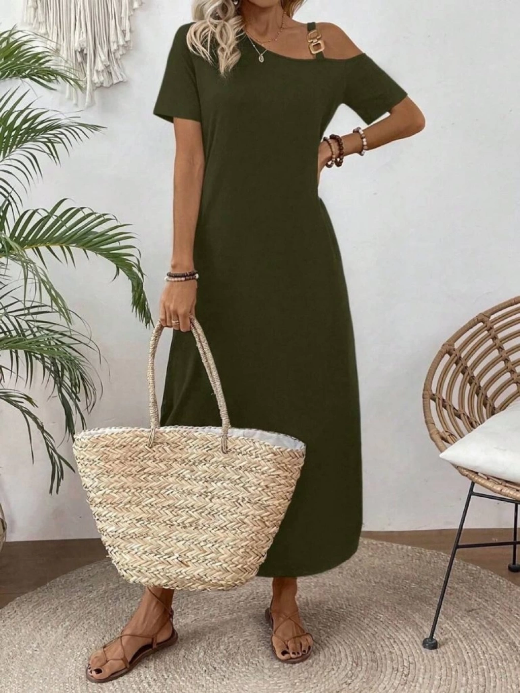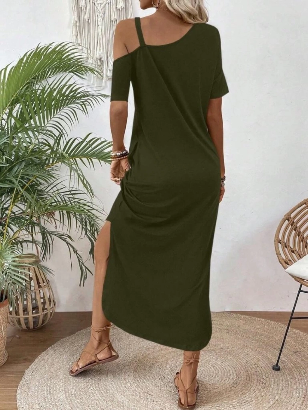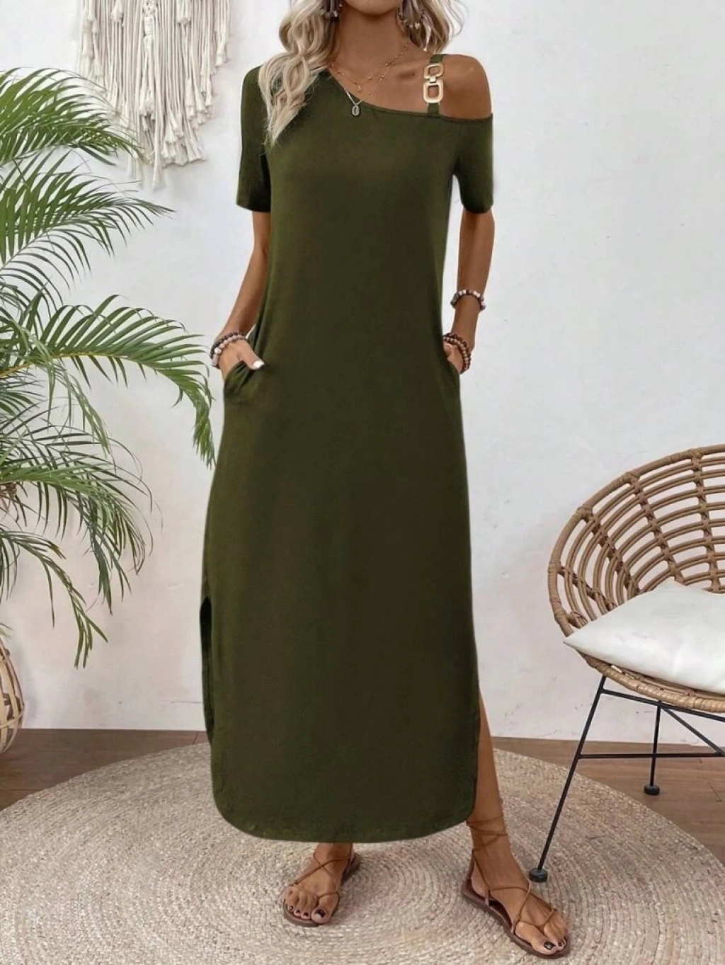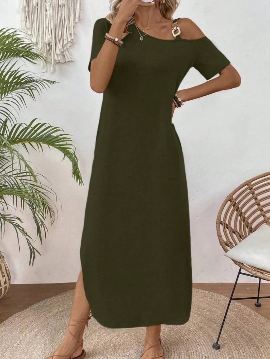 Kadın Tek Omuzdan Açık Toka Detaylı Yandan Yırtmaçlı Maksi Boy Viskon Elbise