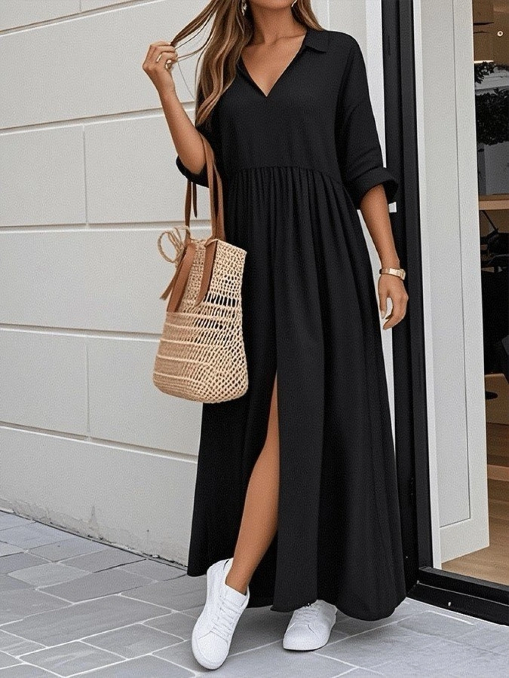Kadın Truvakar Kollu V Yakalı Yırtmaçlı Uzun Aerobin Elbise