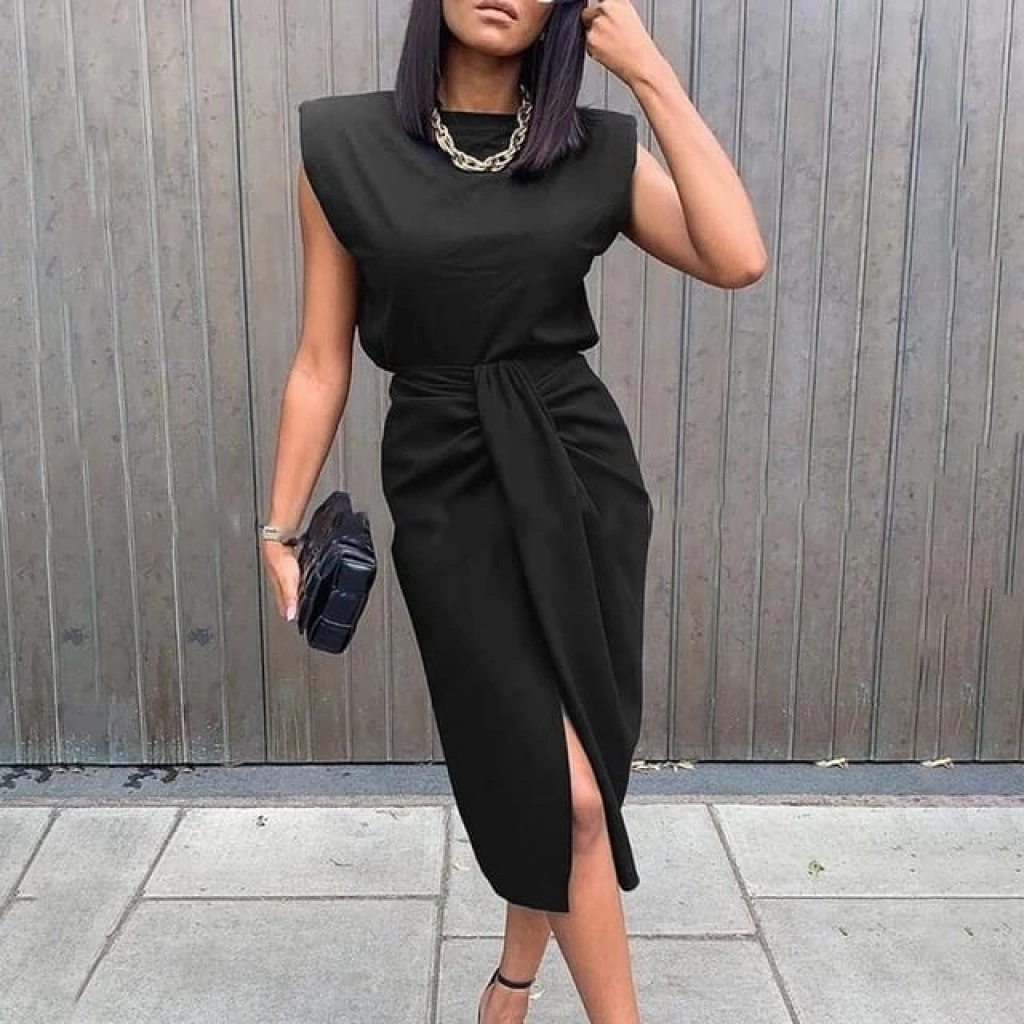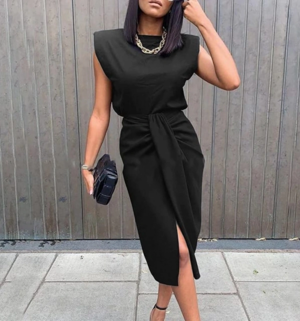 Kadın üst Vatkalı Kolsuz, Alt Büzgülü Yırtmaçlı Arkası Fermuarlı Krep Etek Bluz Takim